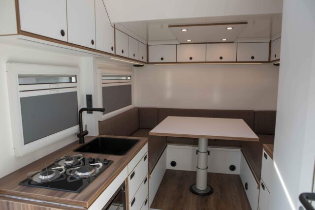 There’s a U-shaped seating area in the back, and the table drops to create a 1.5- by 2.2-metre bed whilst the kids sleep in the over-cab area. The over-cab is huge, probably big enough to sleep four people. This means the kids can go to bed, and we can continue our evening downstairs. We have a crawl-through to the cab, which is super useful, and the kids use that all the time. We have a compact kitchen area on the right, and a large Isotherm fridge/freezer as you enter. The truck is 24 volts, as is the majority of the habitation side, but we drop down to 12 volts for certain appliances.