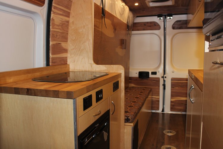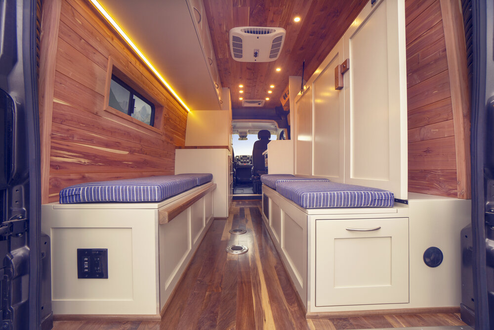 The Rambler is finished in a mix of natural wood paneling with a solid wood floor. The preponderance of unfinished wood gives the interior space a warm feeling that is reminiscent of a cabin. Having been in one of these vans myself, I can confidently say that the quality and precision of the finish carpentry is excellent.