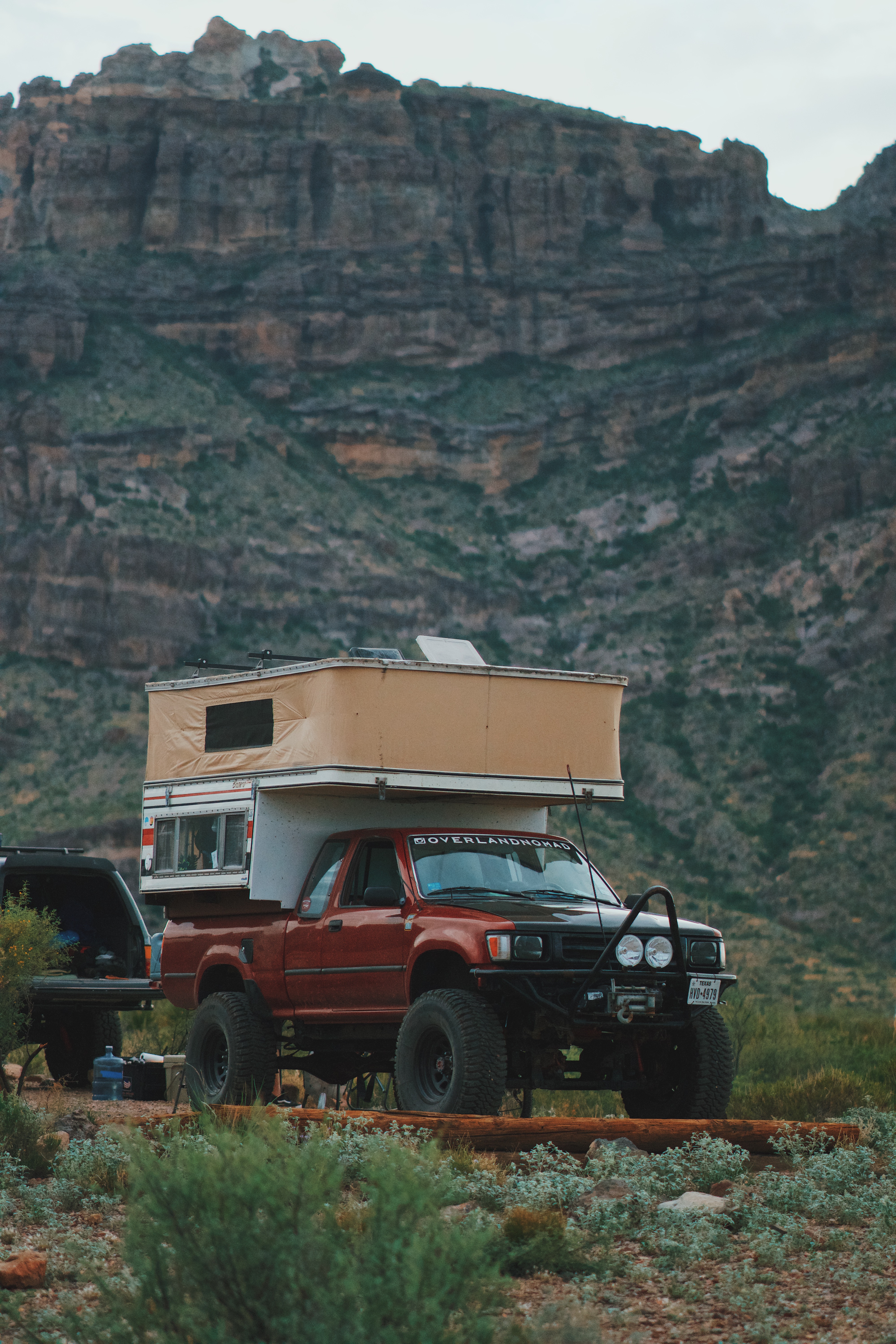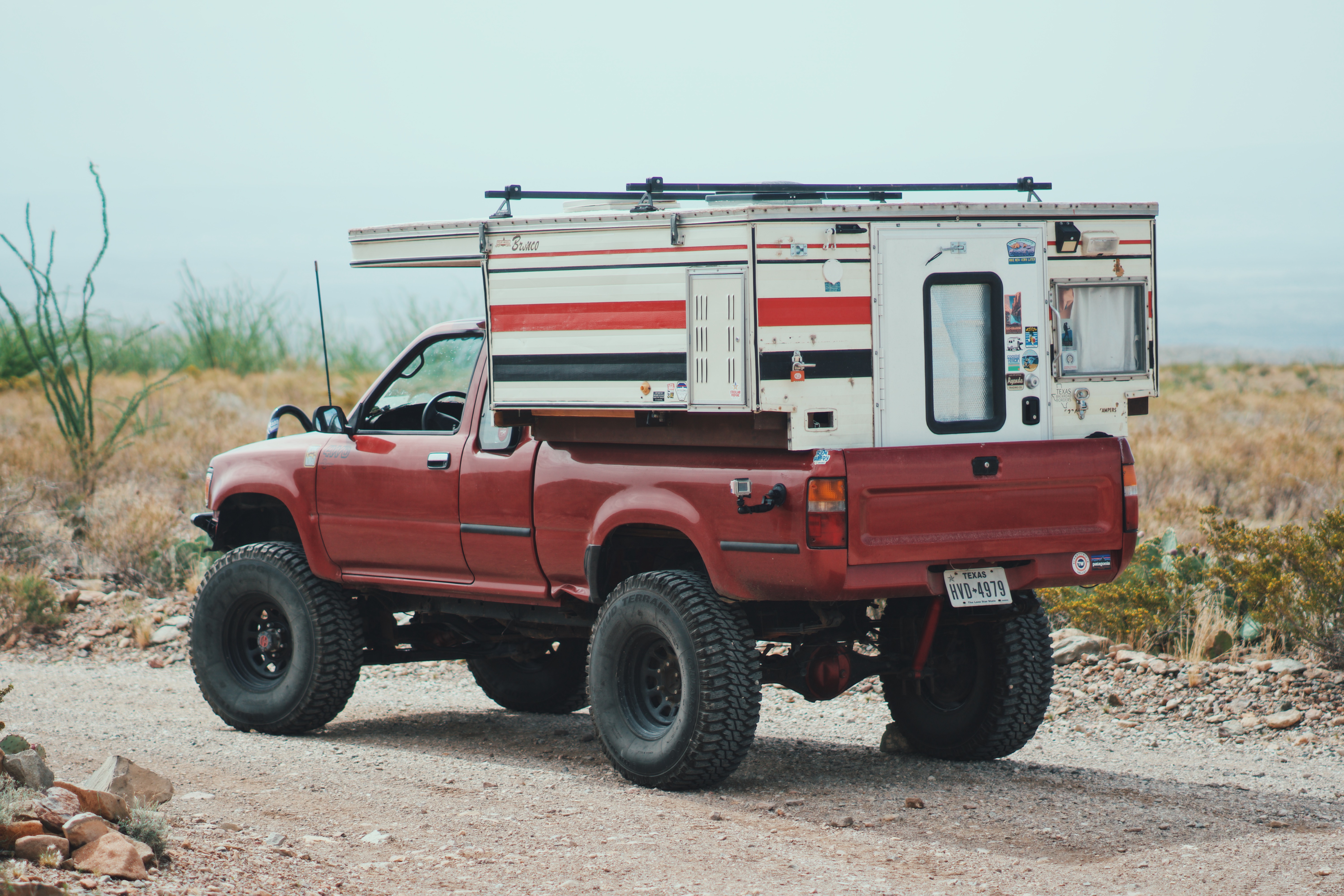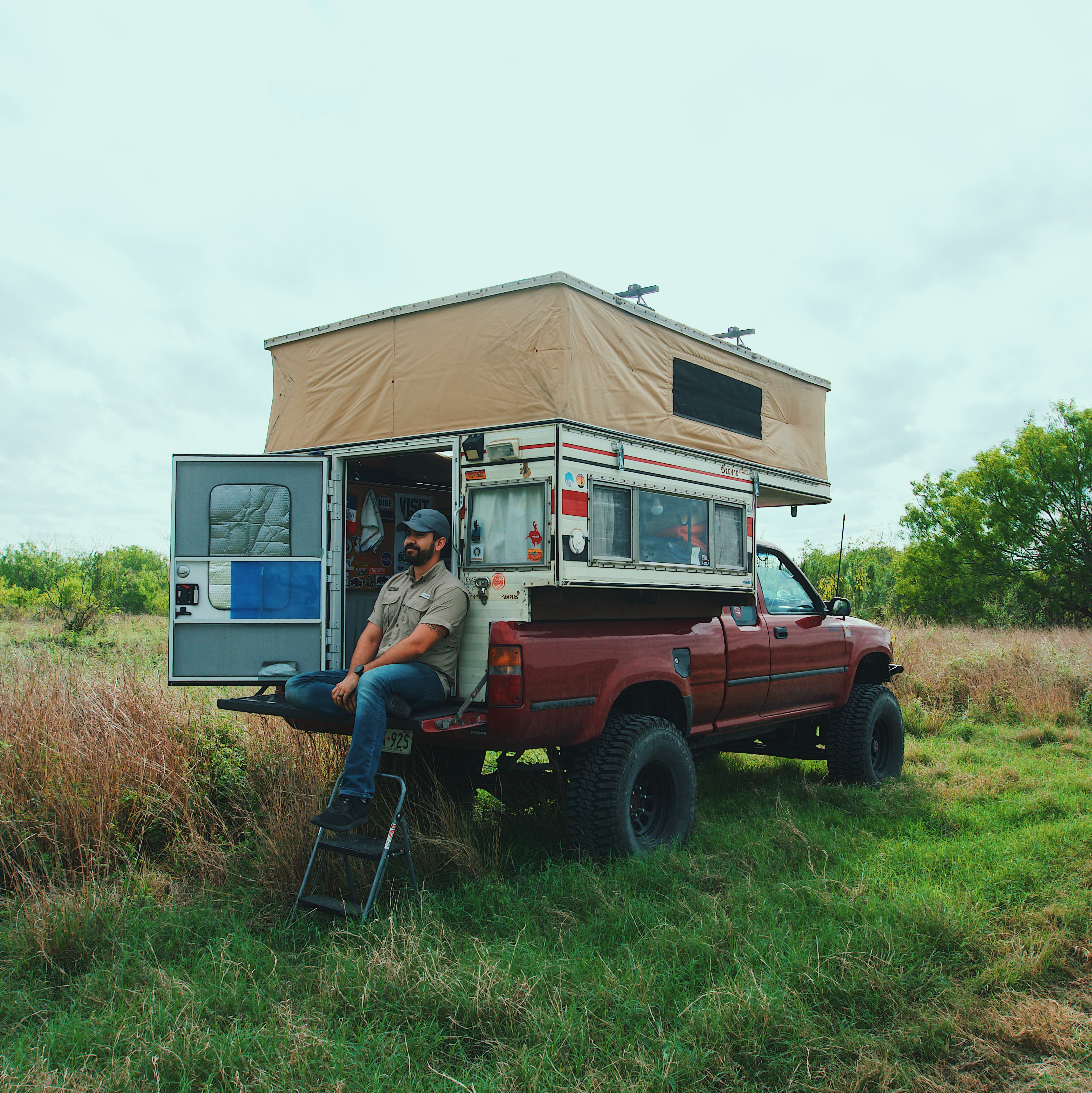 Two years ago, I was browsing the Texas Overland pages when a rather rare and promising camper popped up, a 1981 Four-Wheel Camper designed specifically for the Ford Bronco. Obviously, my Toyota Pickup wasn’t a Bronco, but I couldn’t help but fall in love with it, so I pulled the trigger. The modifications to make it fit the bed of the pickup began shortly after and included adding C-channel bars on the sides and front to make up for the height difference. I had to close up the wall that would have led to the Bronco’s cabin by adding plywood and a white aluminum wall on the outside, as well as perform a myriad of other small changes. In the end, though, it was exactly what I had hoped for, and was perfect for my many trips around Texas.