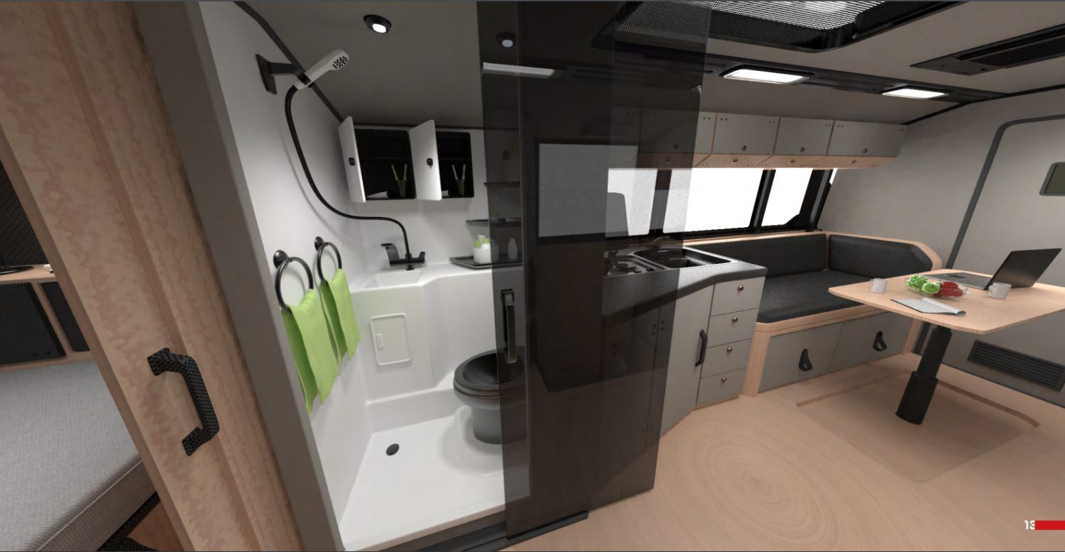 The interior of the cabin appears to be finished with a mix of wood and composite materials. A rigid wall separates the driving area from the cabin with a walk-through door. Overhead storage and additional under-seat and bedroom storage compartments look plentiful. Standalone dining, kitchen, bathroom, and bedroom areas are all easily identifiable. As this particular model does not appear to have a finalized design or layout, there is no official spec sheet detailing cabin systems or features available at the time of writing this article.
