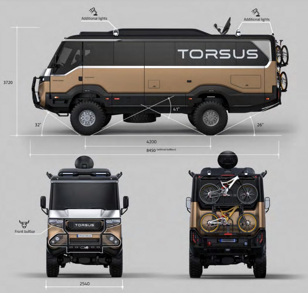 *According to 15.74 inches of ground clearance (as stated in Torsus’ promotional video and a 165.35-inch wheelbase), I calculated a 21.6-degree breakover angle.