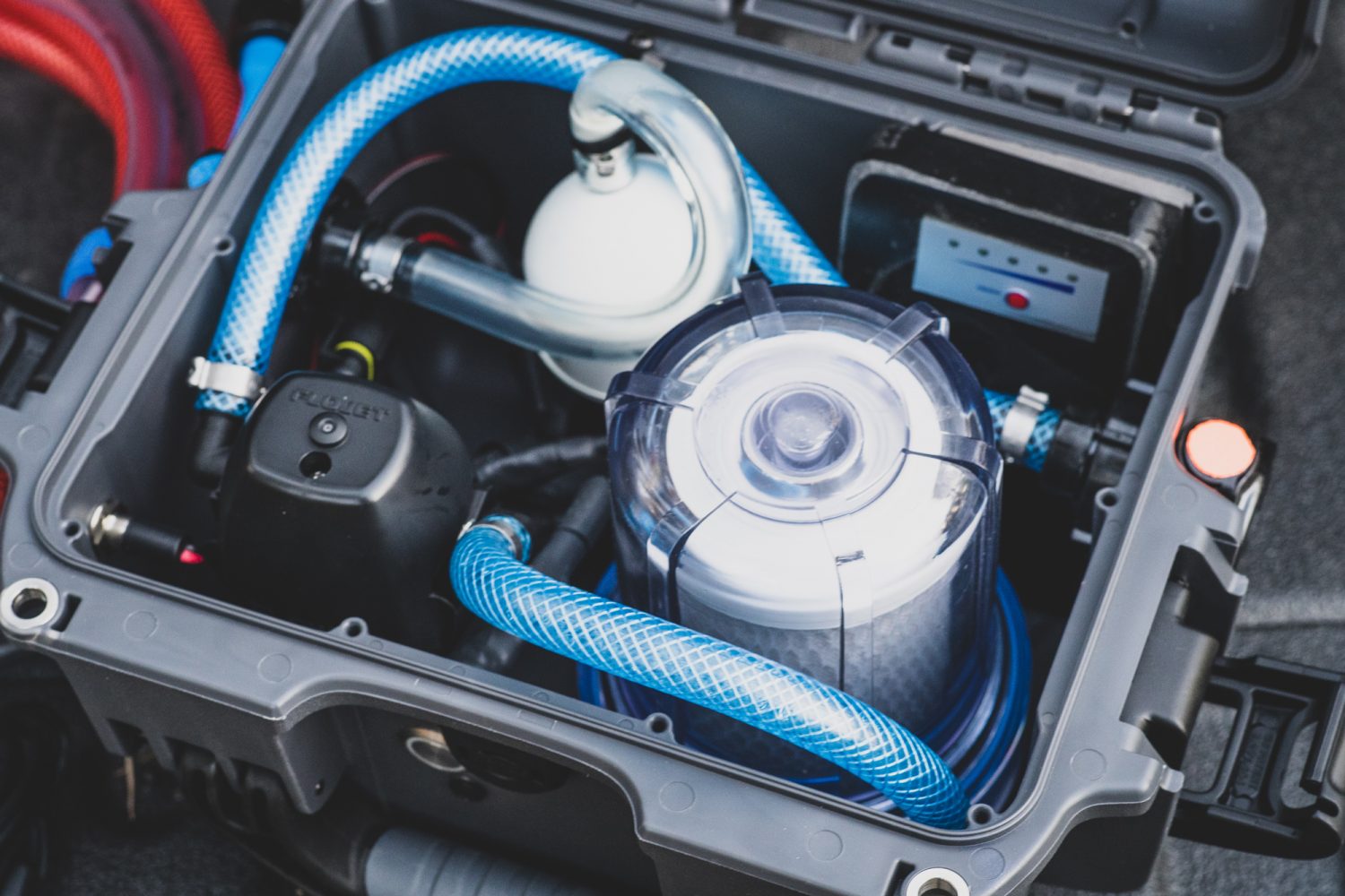 A few things stand out—the first being the durability of the box, a Pelican-style case complete with a lid seal and robust ribbing. All components are visible, including the Flojet pump, UV module, and high-quality, screw-top filter assembly. Quick-connects allow the inlet and outlet hoses to be easily attached, and the push of a button starts the process at 1.1 gallons per minute, powered by the built-in battery. The serviceability of the system also makes owner repair a real possibility.