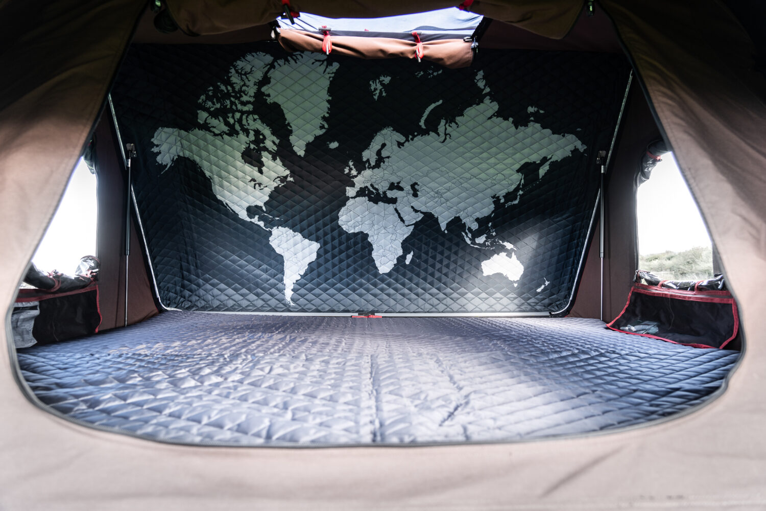 Aesthetically, there is a rather cool world map featured across the inside quilted wall. What’s more, there is smart red trim running throughout the canvas to accent the exterior and interior, which extends to the additional fabric hiding part of the supporting stainless steel bar. On another note, built-in mesh storage pockets on both sides of the tent now come as standard, rather than an add-on accessory—convenient for sunglasses, head torches, small devices, etc.