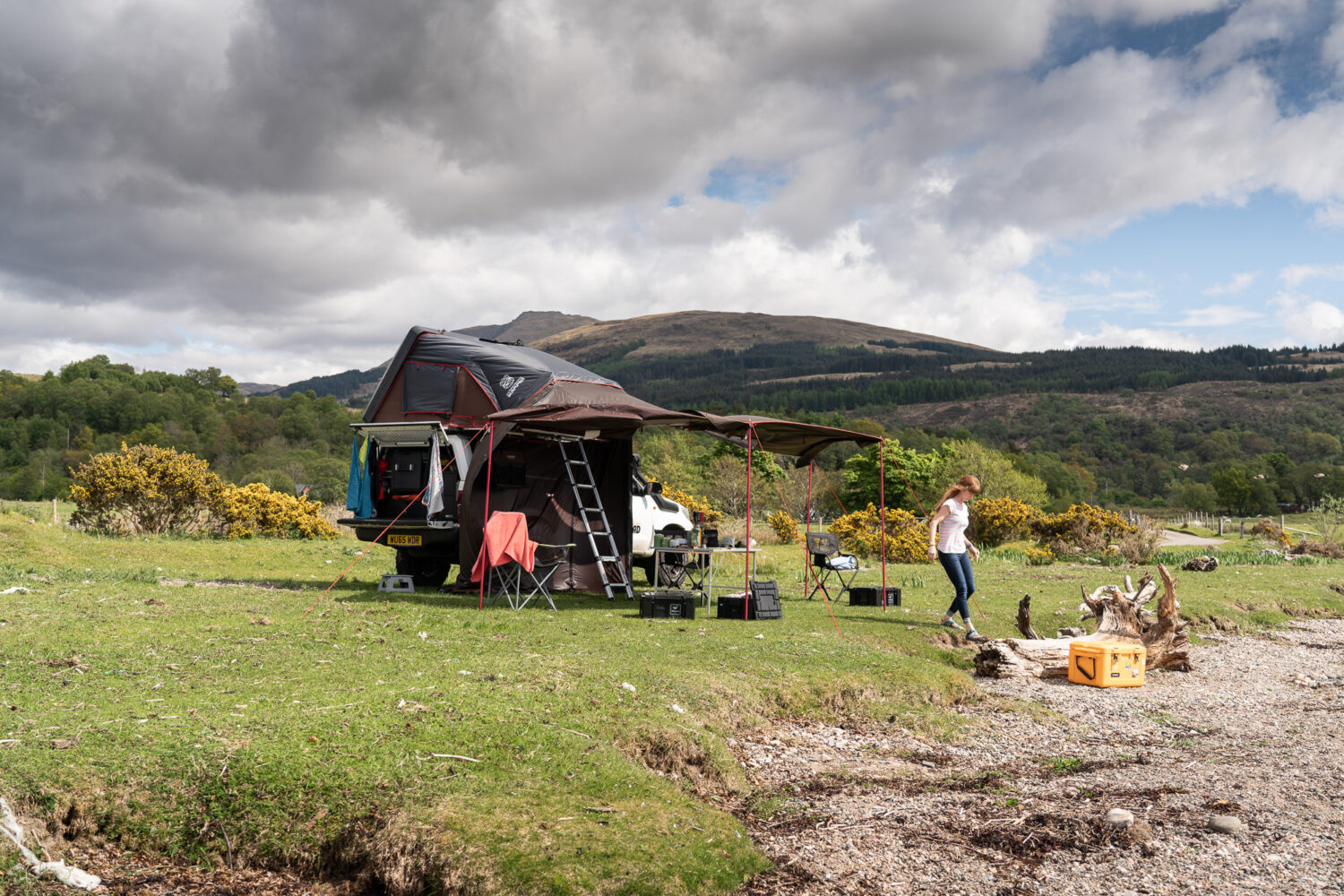Conveniently, it’s a roomy space to set up our stall, including a table for four, three Front Runner Wolf Pack boxes, two chairs, and us pair. Moreover, it’s a protective shelter to take refuge from the deluge. When it rains in Scotland, you know about it. Happy as a pig in muck, I can even cook inside and essentially carry on as I would outside.