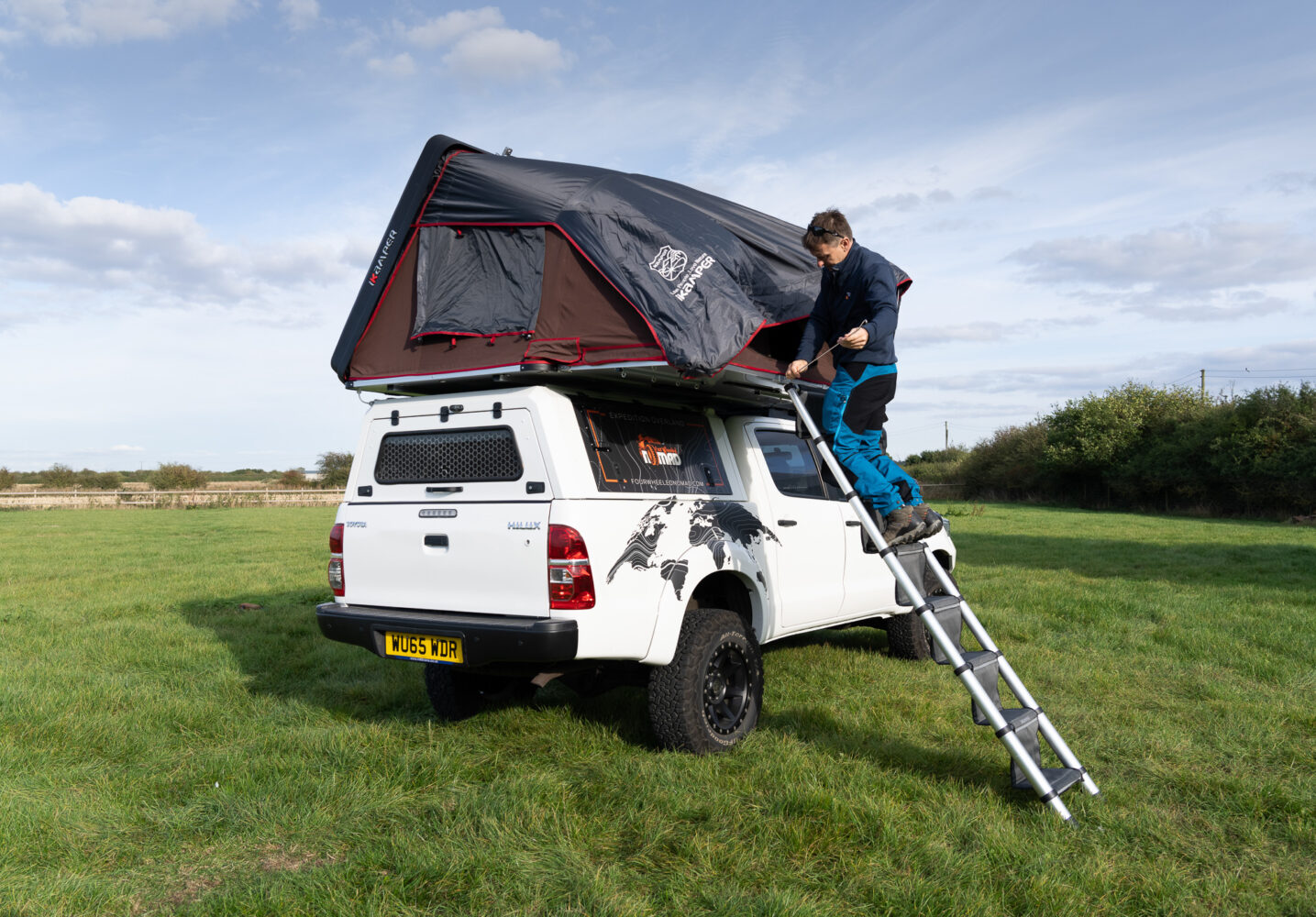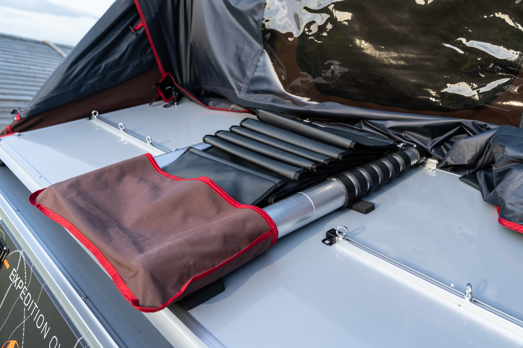 Firstly, one of the winning upgrades for me is a redesigned, more practical telescopic ladder. It unfolds with flatter steps for increased safety and comfort. Indeed, it’s distinctly nicer underfoot without footwear on while ascending, descending, or stationery. It’s also worth mentioning the welcome addition of straps that self-tuck in any overhanging fabric as the lid eases to a close on the gas struts.