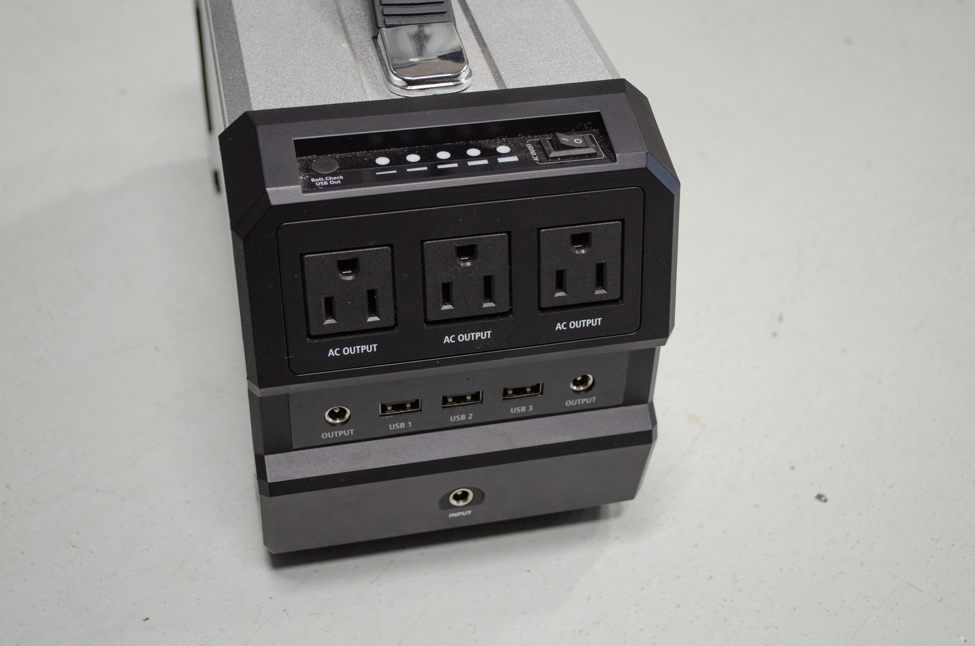 When it comes to using the 444 everything works exactly as you would expect it to and that is a full compliment. You simply turn it on and plug anything that needs power into it. There are no menus to work or small buttons to locate. It just figures it out and provides power. A row of LED lights gives a simple display of the remaining battery life. The eight forward-facing plugs include three 110V and three USB ports, which allows you to plug in just about anything without having to decide what deserves power the most.