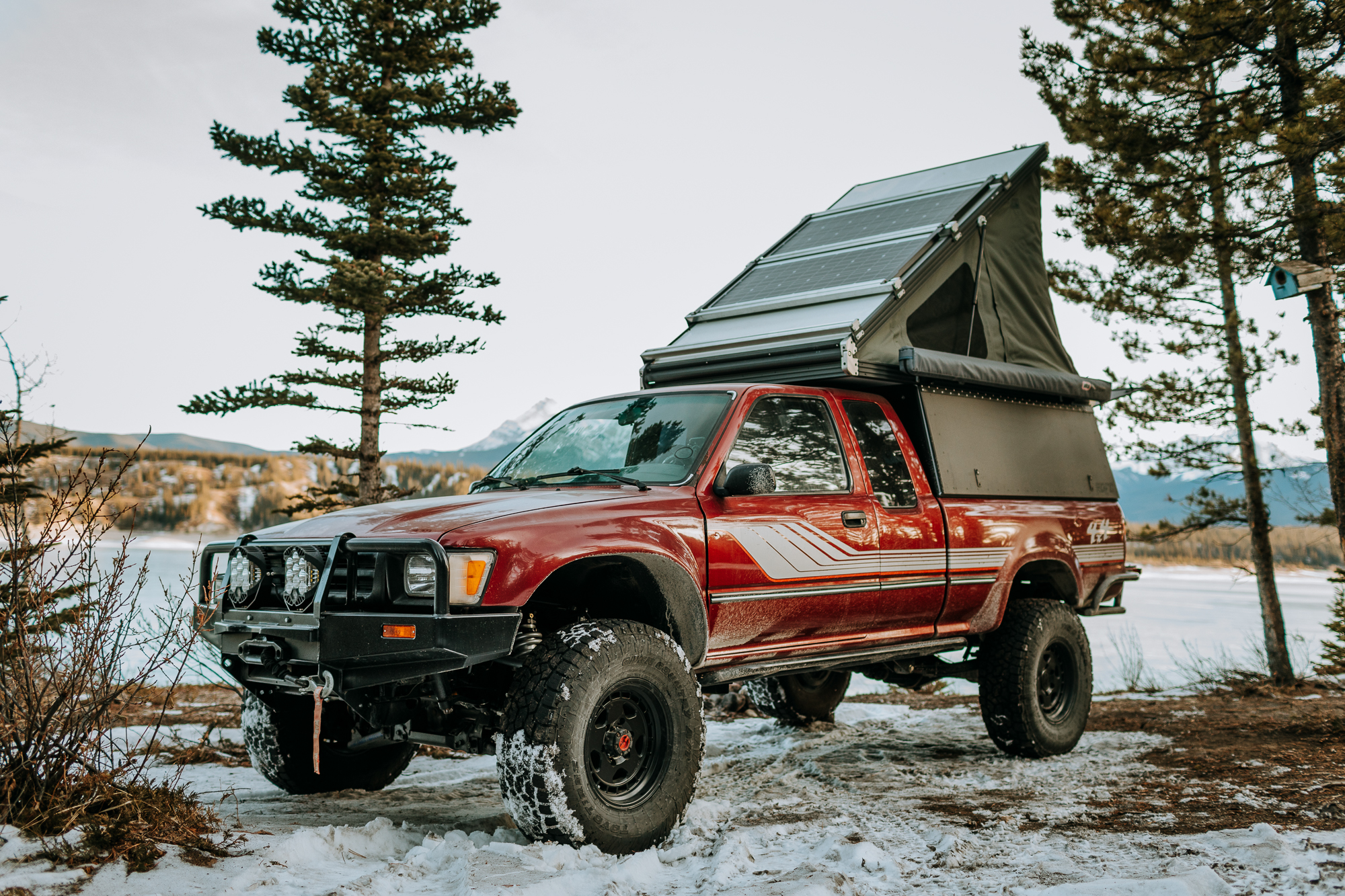 As the wind howls across a frozen lake, our 1990 Toyota Pickup sways back and forth. It’s winter in the Rocky Mountains, and the snow falling sideways from the dark grey sky is proving it. We hop into our Go Fast Camper, battered by 60-kph gusts, and switch on the heater, cranking the heat up as high as it goes. Outside, the sun sets, and the temperature drops, but we’re stripping off our down jackets and kicking off our boots within minutes.