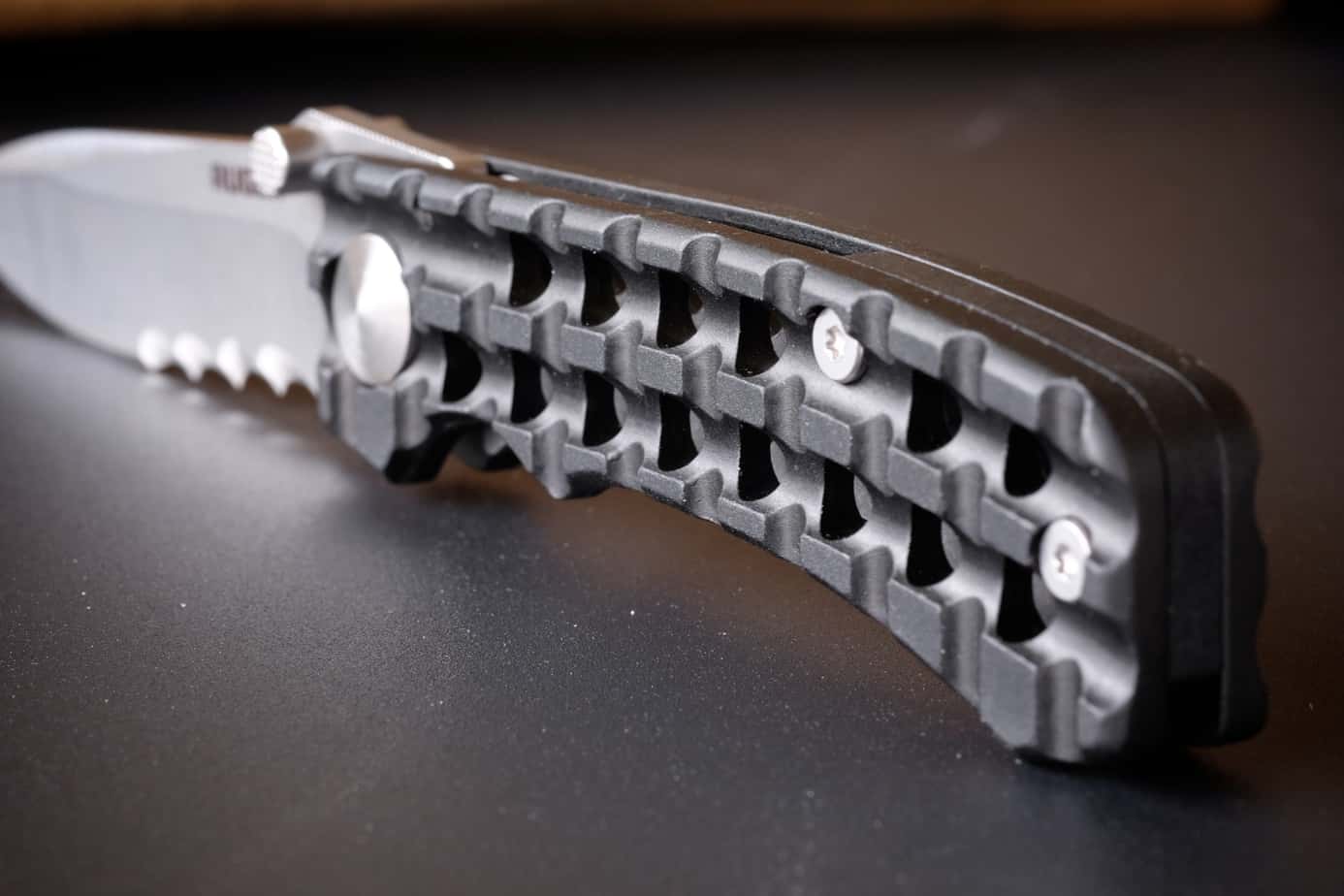 Designed by the legendary Bill Harsey, the most unique attribute of the knife is the pronounced machining of the aluminum handle plates. Created to emulate the Picatinny rail of a rifle, the handle definitely has a tactical aesthetic that evokes the Ruger brand mission. When you pick up the Go-N-Heavy Compact––you know it’s there. Despite a surprisingly low weight of just 4.5 ounces, it has a commanding presence in-hand. I wouldn’t say big, but it does fit within my palm securely. If big is what you seek, the Compact has a larger sibling which is genuinely––big.