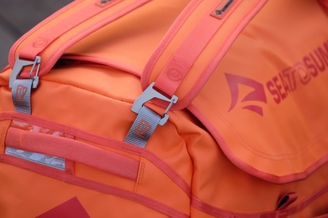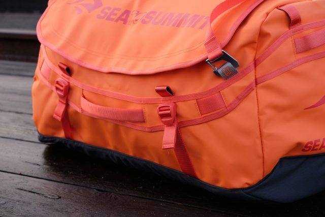 Like other duffles in its class, it’s constructed of heavy-duty waterproof and abrasion resistant fabric throughout. The Bottom has an extra layer of heavy nylon fabric for added durability and every seam has been internally reinforced with nylon tape. The perimeter of the bag is banded with a secondary layer of fabric anchoring an assortment of well-placed handles, compression straps, lash points, and strap attachments. Sea to Summit’s product engineers used common sense and good design restraint when fitting the exterior with the necessary grab points––but no more than needed.