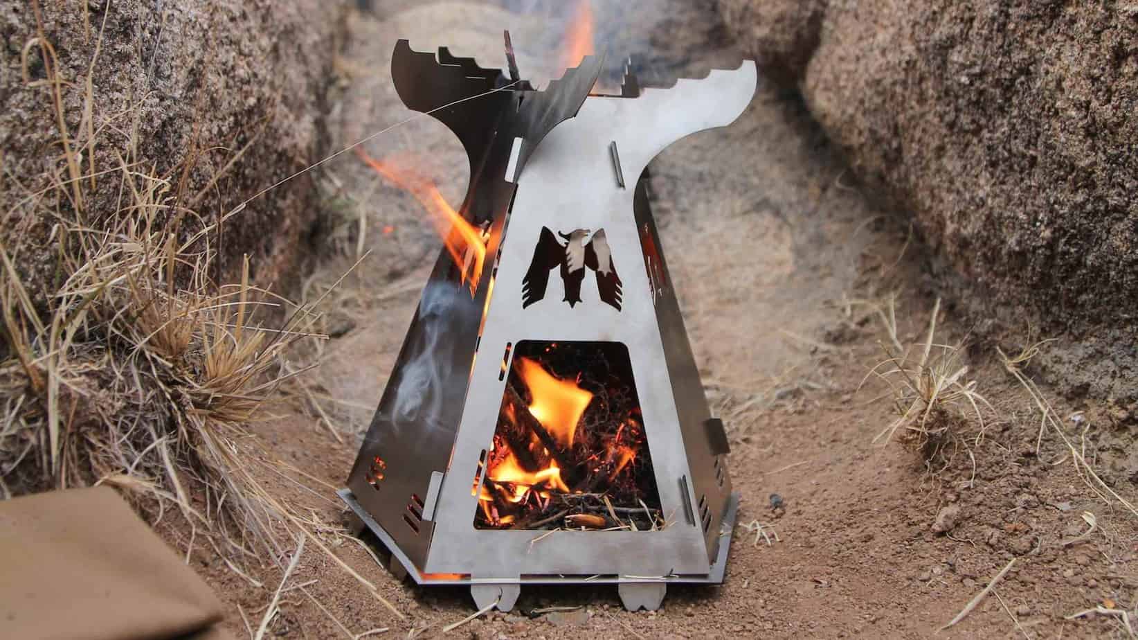 Marc Mummert of California is first and foremost a master craftsman dedicated to the art of making fine knives. He also creates unique tools and just recently launched his Phoenix wood burning stove. Constructed of 6AL/4V titanium, the Phoenix is a lightweight, seven panel stove that folds flat for easy transport. To say it folds flat is a bit of an under statement. With all seven panels stacked tightly together the entire package might be 1/8th inch thick. On our scale it also came in at just under a pound. As wood burning stoves go, that’s impressive but not all together unusual. What is exceptional is the strength, size, and features of the Phoenix. With a wide base and five “winged” pot supports, the Phoenix is capable of shouldering any size pot with a maximum weight of ten pounds. The five-sided structure includes one panel with a generously sized door to facilitate easy access to the flame within, and the elaborately shaped vents keep the fire breathing for an optimal burn.