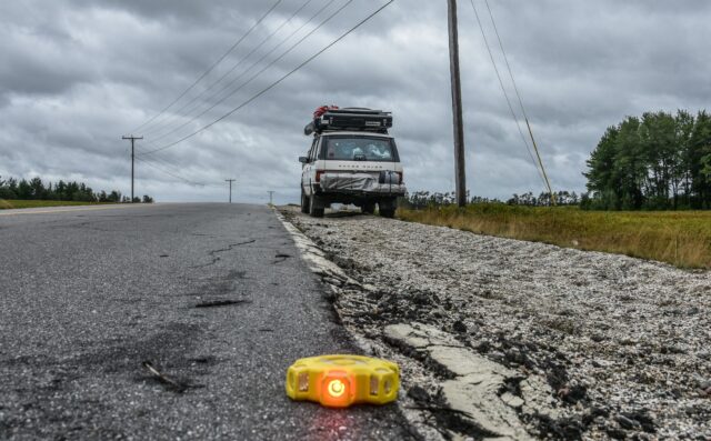 Our vehicle for the USA trek was a 1994 Range Rover Classic which only broke down three or four times. One spectacular breakdown occurred up in northern Maine beside a blueberry field, and we were very happy to be carrying the Michelin-branded road flares.