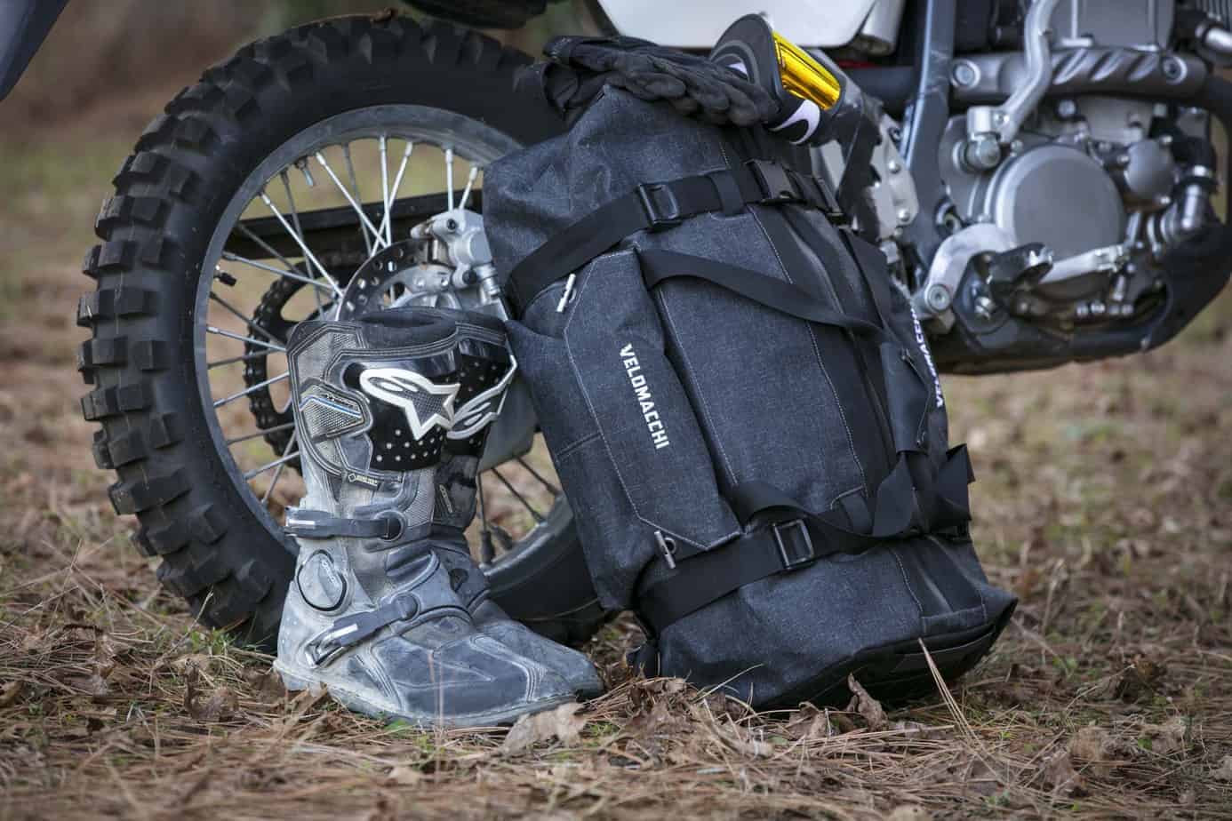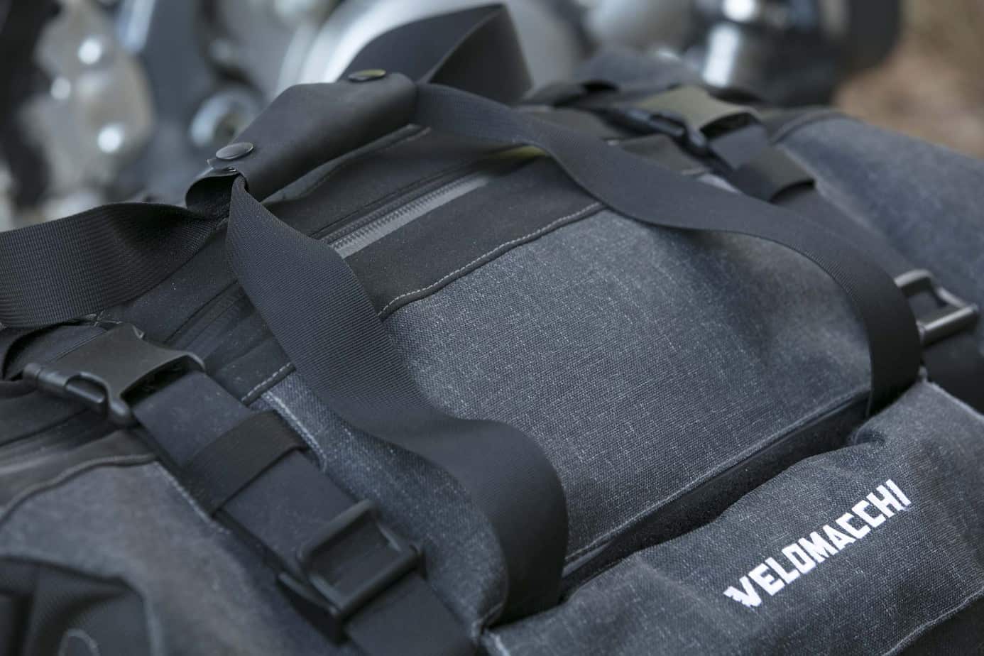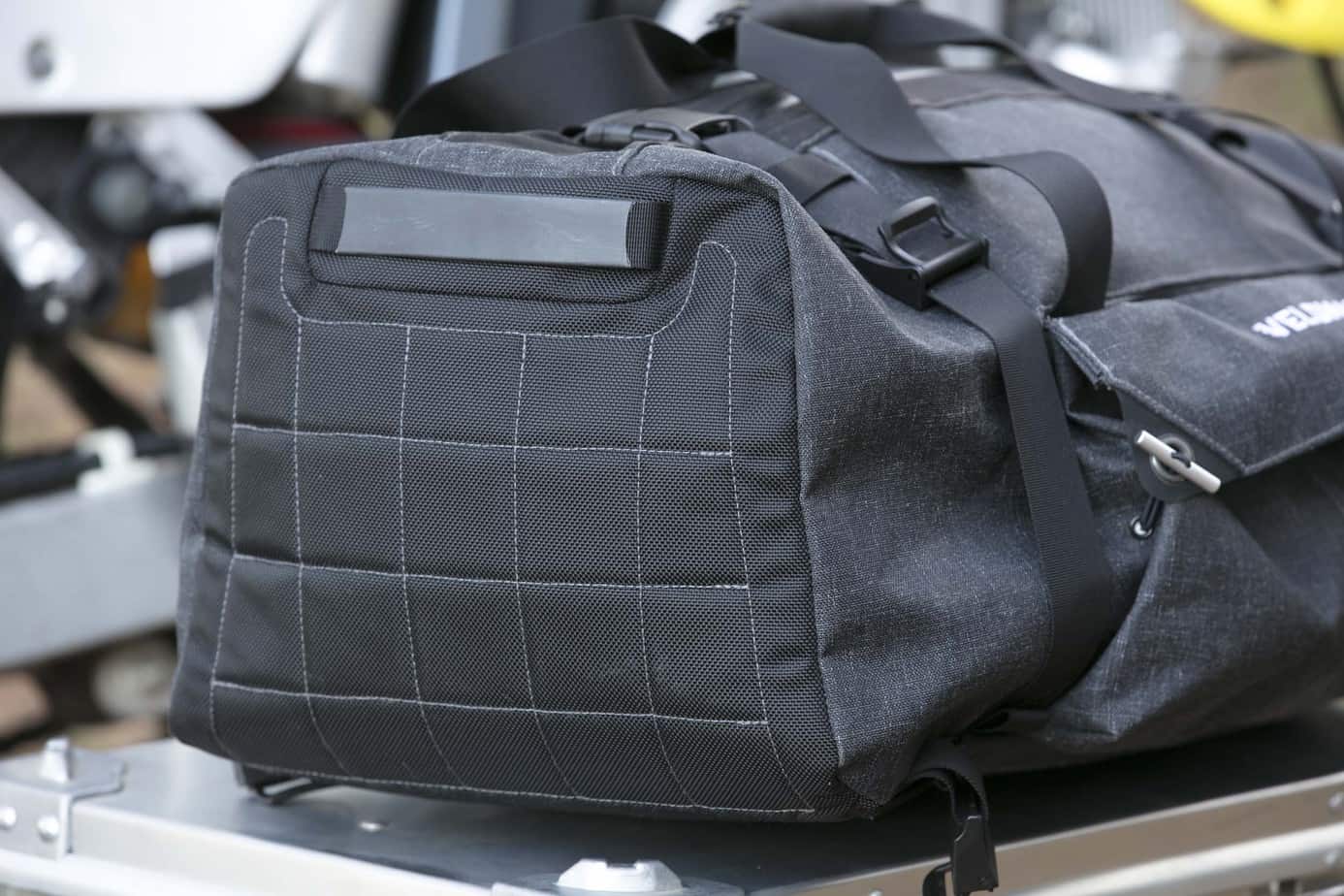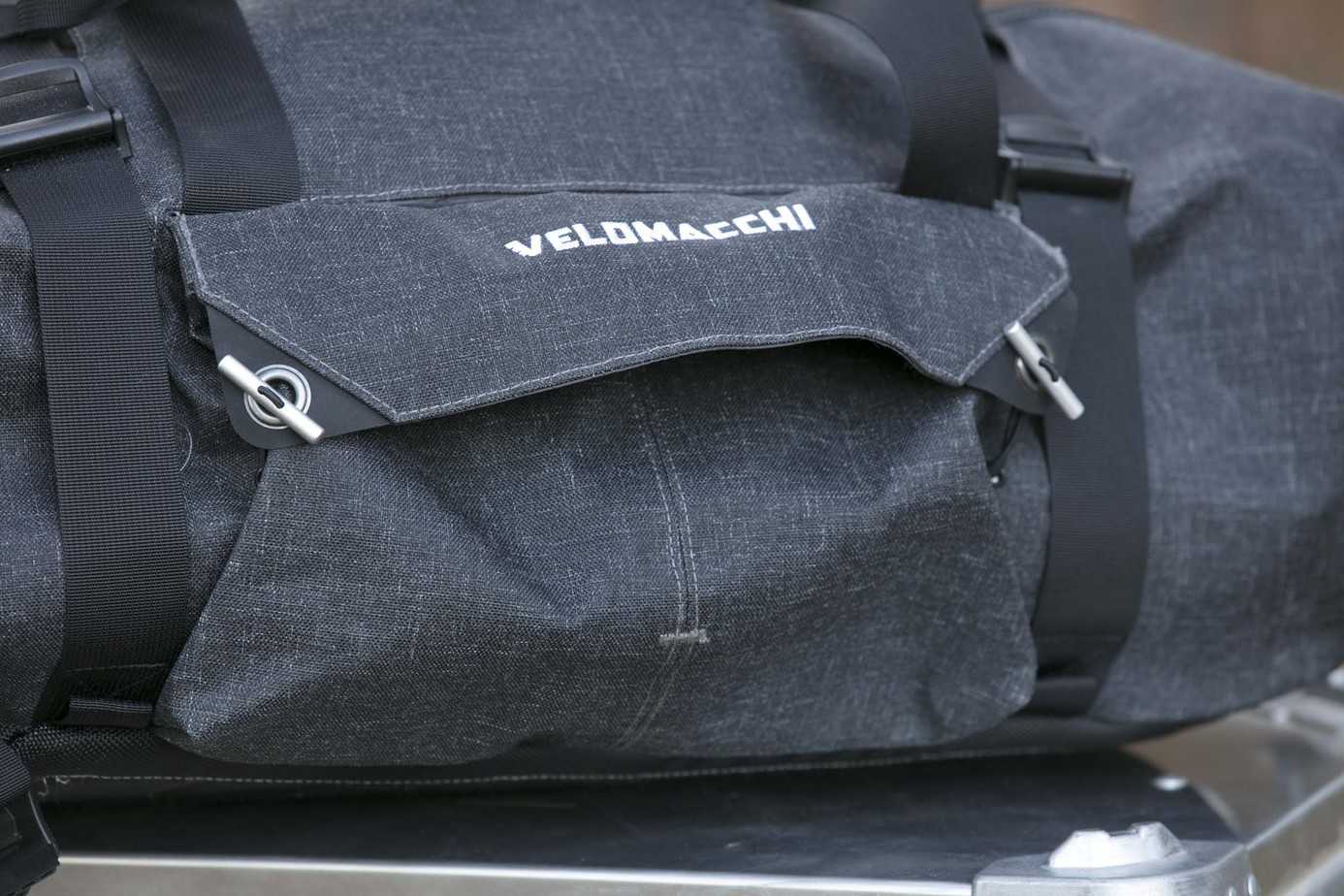 Last year I picked up a Velomacchi Speedway Hybrid 50-liter duffle and have since utilized it during a variety of trips. My first impressions were that the 1000D exterior fabric and rubberized YKK #10 zipper would do a great job of keeping my clothes dry, and they have. Dual compression straps cinch things down enough for the Speedway to be used as a carry-on, and also proved lashing points for securing it to the back of a bike or on a roof rack. The sturdy shoulder harness, which is wide enough so as to not cut into my clavicle, features cam-lock adjusters and a magnetic sternum strap. I like that both the shoulder and carry straps tuck neatly into pockets, thus reducing the possibility of snagging. Velcro pockets frame both sides, and the zipper’s T-handle is easy to grasp with gloved hands.