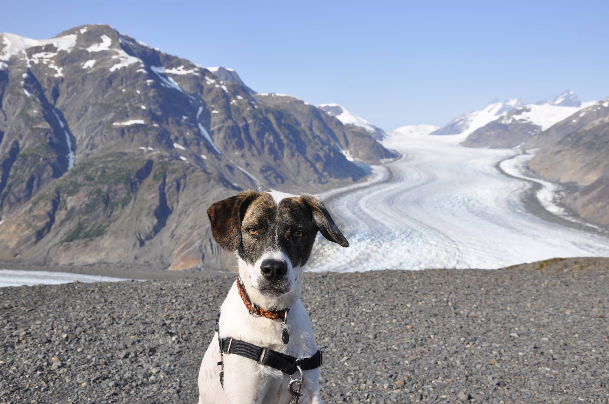 Hugo feeling chilly at Salmon Glacier, British Columbia.