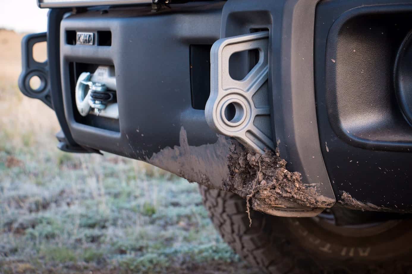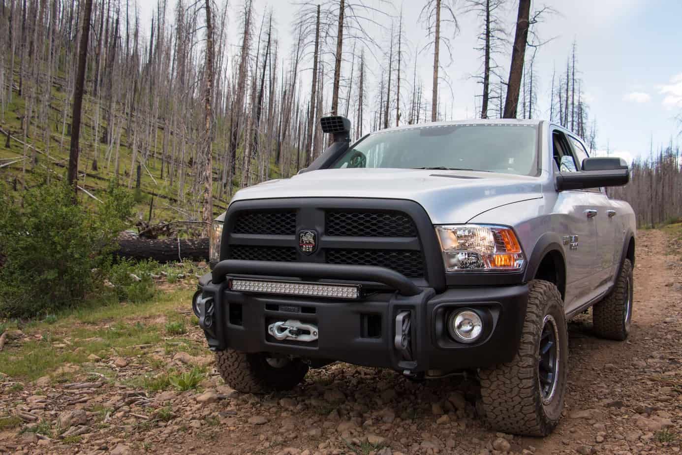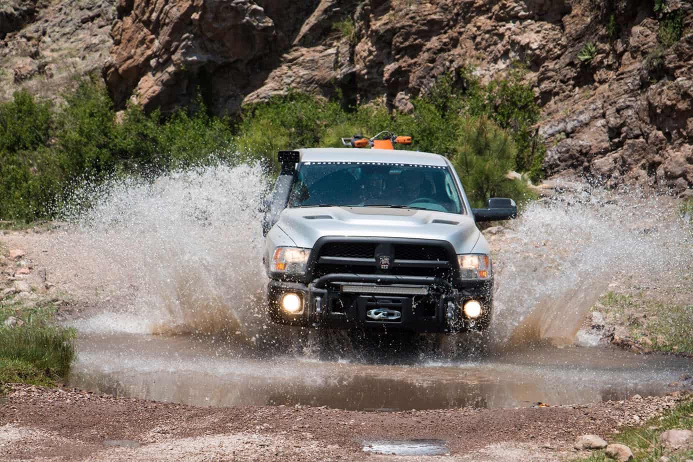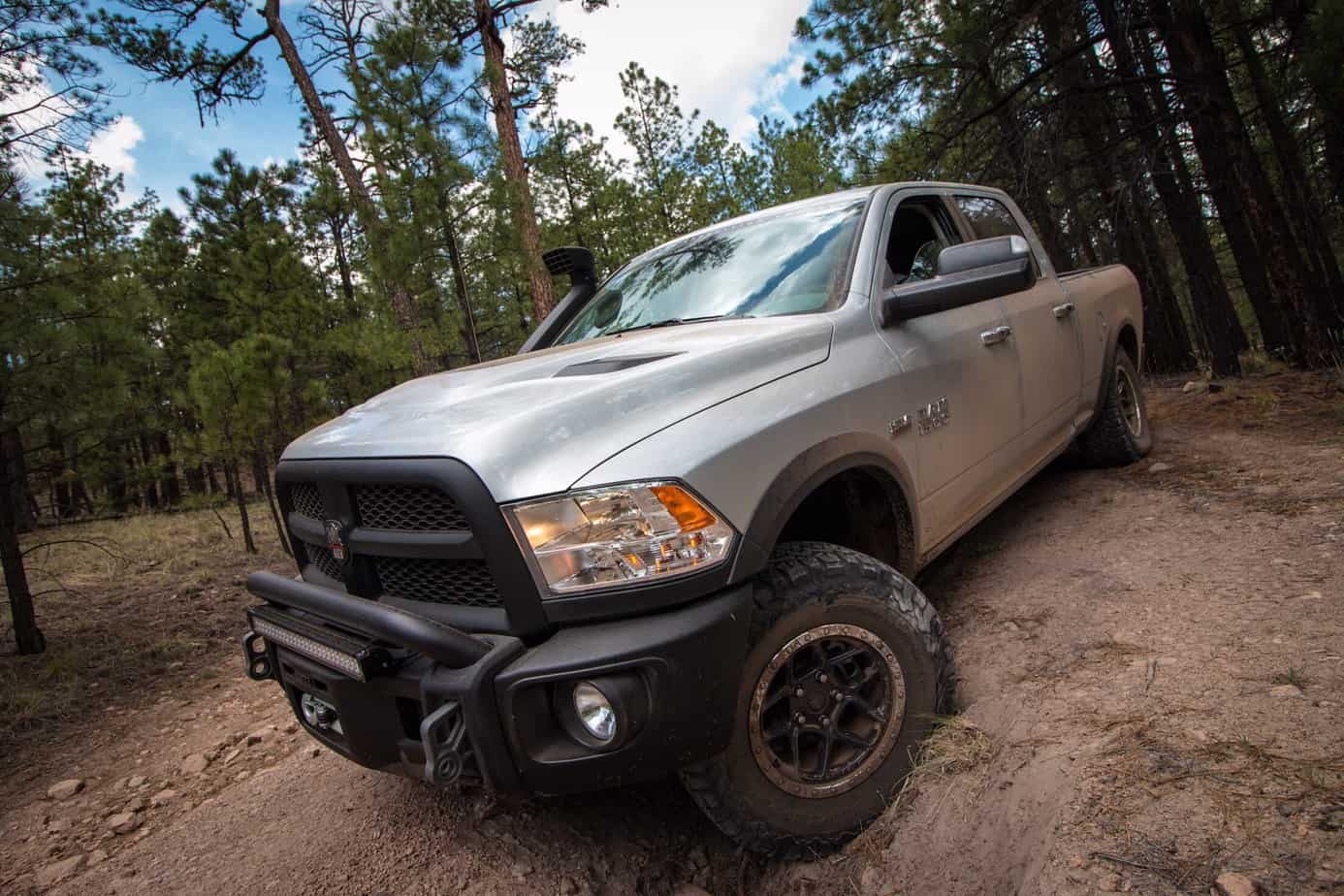 Overall clearance is good, but the Recruit does feel a little low amidst the AEV Prospectors and JK’s. The seating position of the 1500 is flatter than in the 2500, which reduces visibility over the hood, and makes it harder to confidently navigate the trail. We also noticed that the front left tow hook rubbed in the dirt twice during the week, which leaves something to be desired from the approach angle. Even so, the engineers’ work relocating the axle center above the skid plate is nothing short of brilliant, and when combined with the four inches of lift and 35″ tires, provided enough clearance to make every obstacle on our trip a drama free affair. Sure, an additional inch of lift or 37″ tires would be nice, but they’re far from necessary.