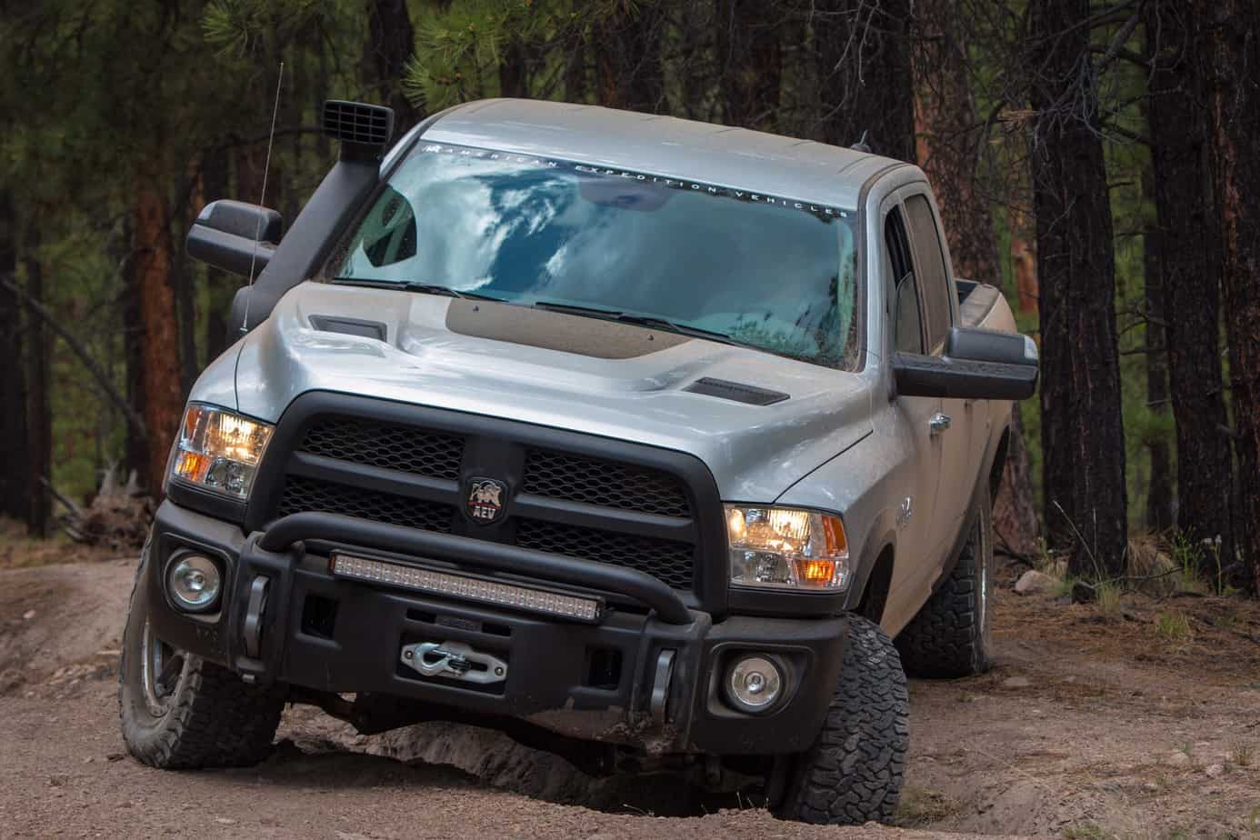 But this comes with a trade-off right? Aren’t independent front ends limited in articulation and clearance? Yes, but AEV has done their best to minimize these drawbacks, and based on the truck’s trail manners we’d say they’ve done a darn good job. In cross axle situations the Recruit stays in contact with the ground far longer than I had expected, and when it does eventually lift a wheel the traction control keeps forward momentum with very little spin. It still does not have the range of travel seen on their Power Wagons or 2500s, but it’s an impressive stretch nonetheless.