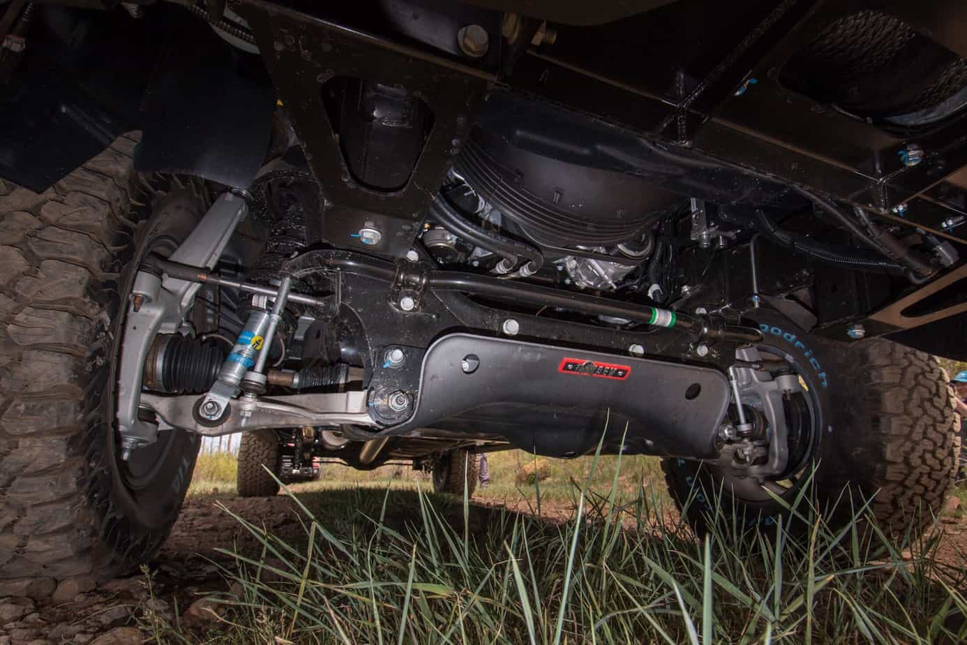 For those who didn’t read our initial release article, the first thing you need to know about the Recruit is that it’s based on an Independent Front Suspension (IFS) vehicle. This separates it from every other AEV model in production, and makes the 4” Dual Sport Suspension lift far more complex than those used on their solid axle trucks. It starts with military grade A206 T4 cast aluminum steering knuckles, which reduce unsprung weight and help shift the front hubs forward by 8mm to eliminate tire rubbing. They then move the axle center off of the engine mounts and onto chassis mounts via bushings and a 4mm steel skid plate. This not only improves clearance, but adds protection for vital components. The final steps are swapping out the shocks, and adjusting the rear suspension to retain the factory pinion angles and geometry.