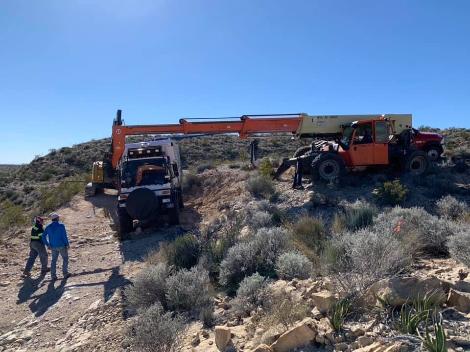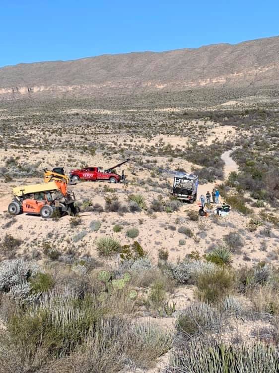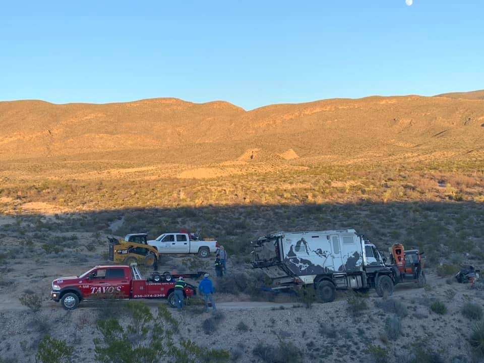 About two weeks ago, we reported on a Unimog which had unfortunately been flopped in Big Bend National Park, forcing a closure of Old Ore Road. You can read about it here. With the huge increase in park traffic for the holiday season we knew it was only a matter of time before they’d bring heavy equipment in to extract this beast, and now it appears they have.