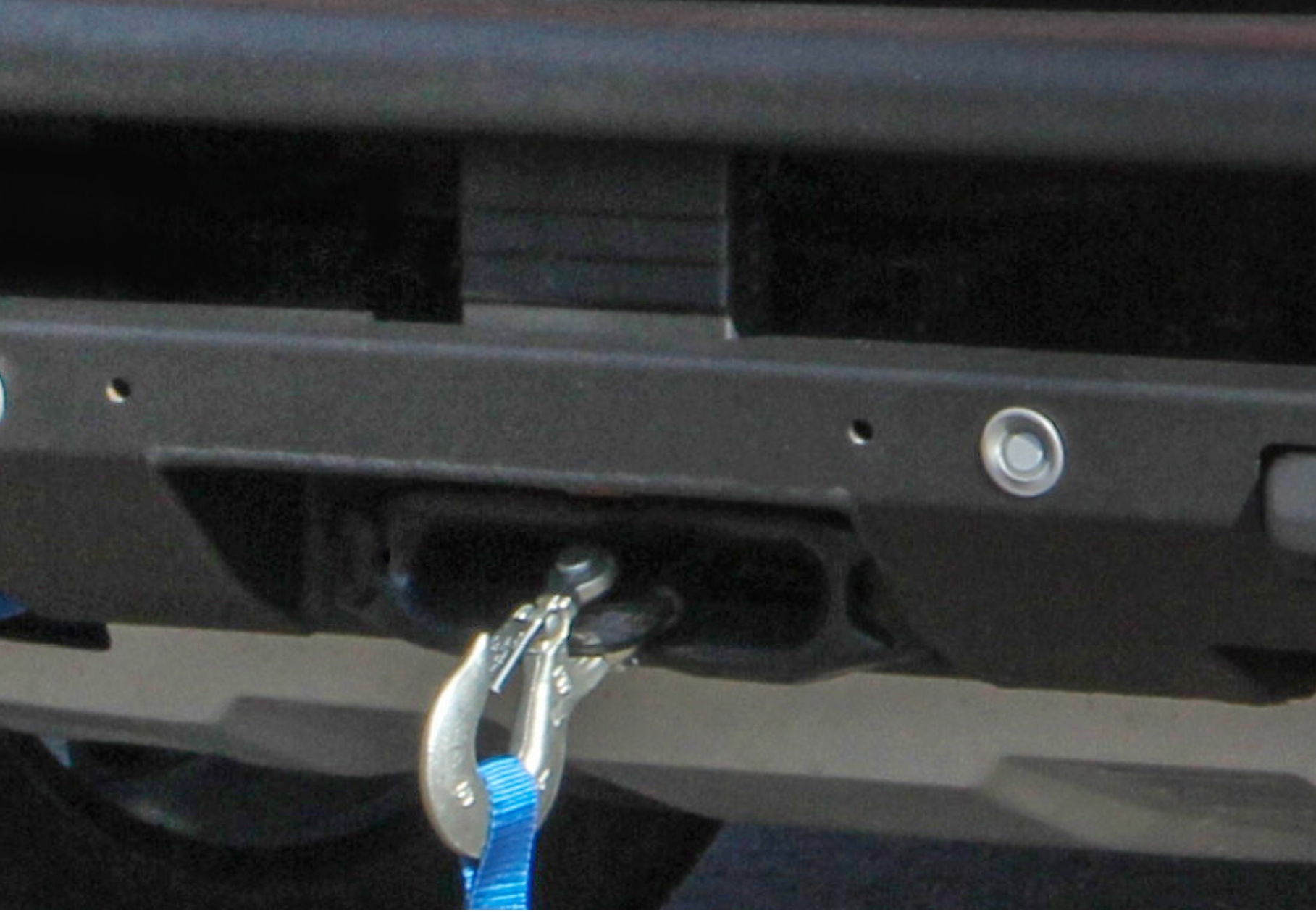 This cropped photo shows the frame-mounted recovery points and the reinforced jacking points, along with the parking sensors and fog lamps.