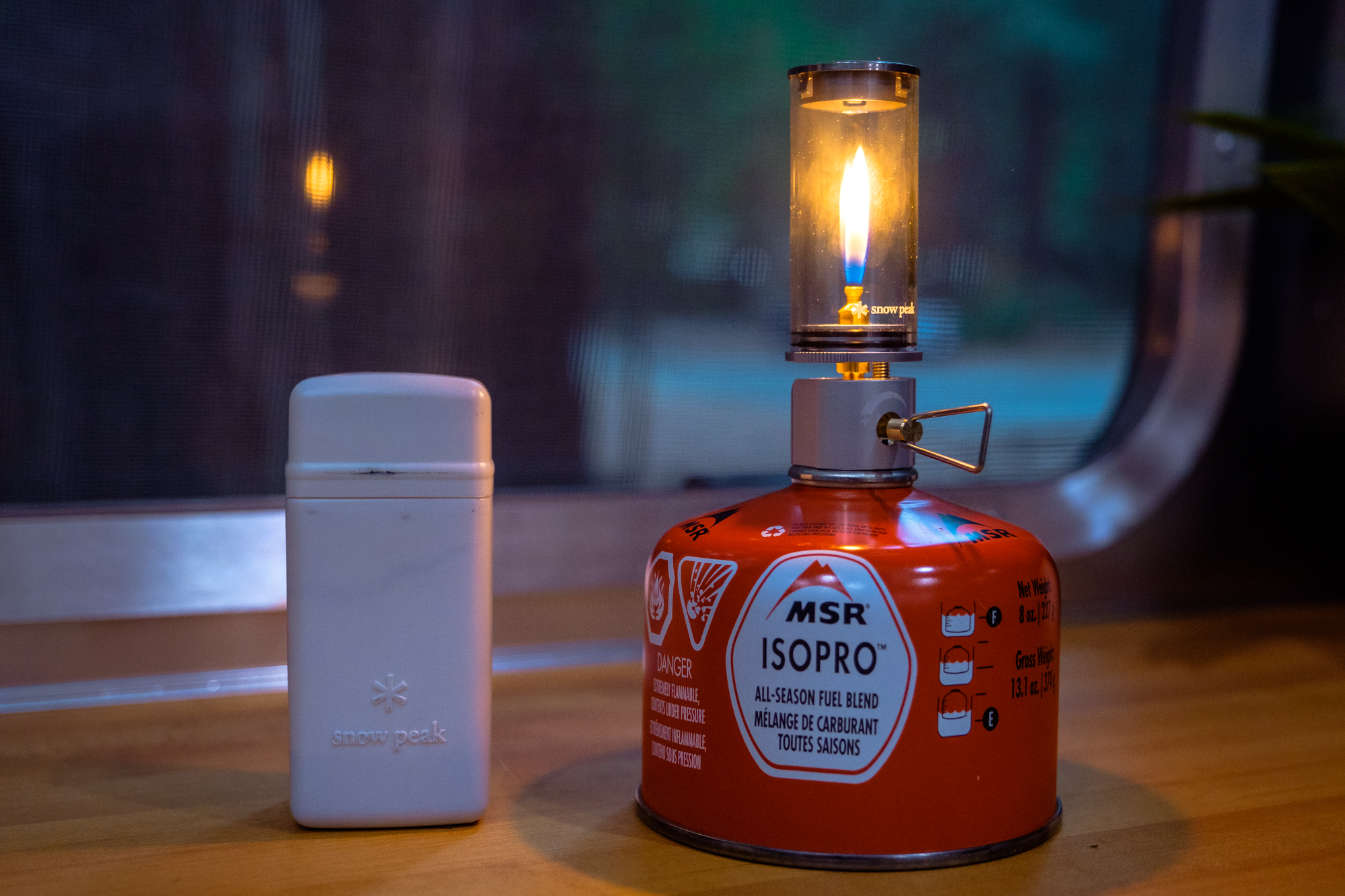 As you’d expect from a Snow Peak product, it’s well made, really cool, and more than a little unnecessary, yet I purchased this product all the same and don’t regret it. It threads onto a fuel canister, and once turned on, slowly fills the glass chamber with gas. Yes, glass chamber. It comes with a small padded tube for protection. Using a lighter or match, you can ignite the flame and watch as it slowly burns off the last of your propane. A twist valve at the bottom operates with satisfying smoothness while adjusting the size of the flame for burn rate and amount of light given off.