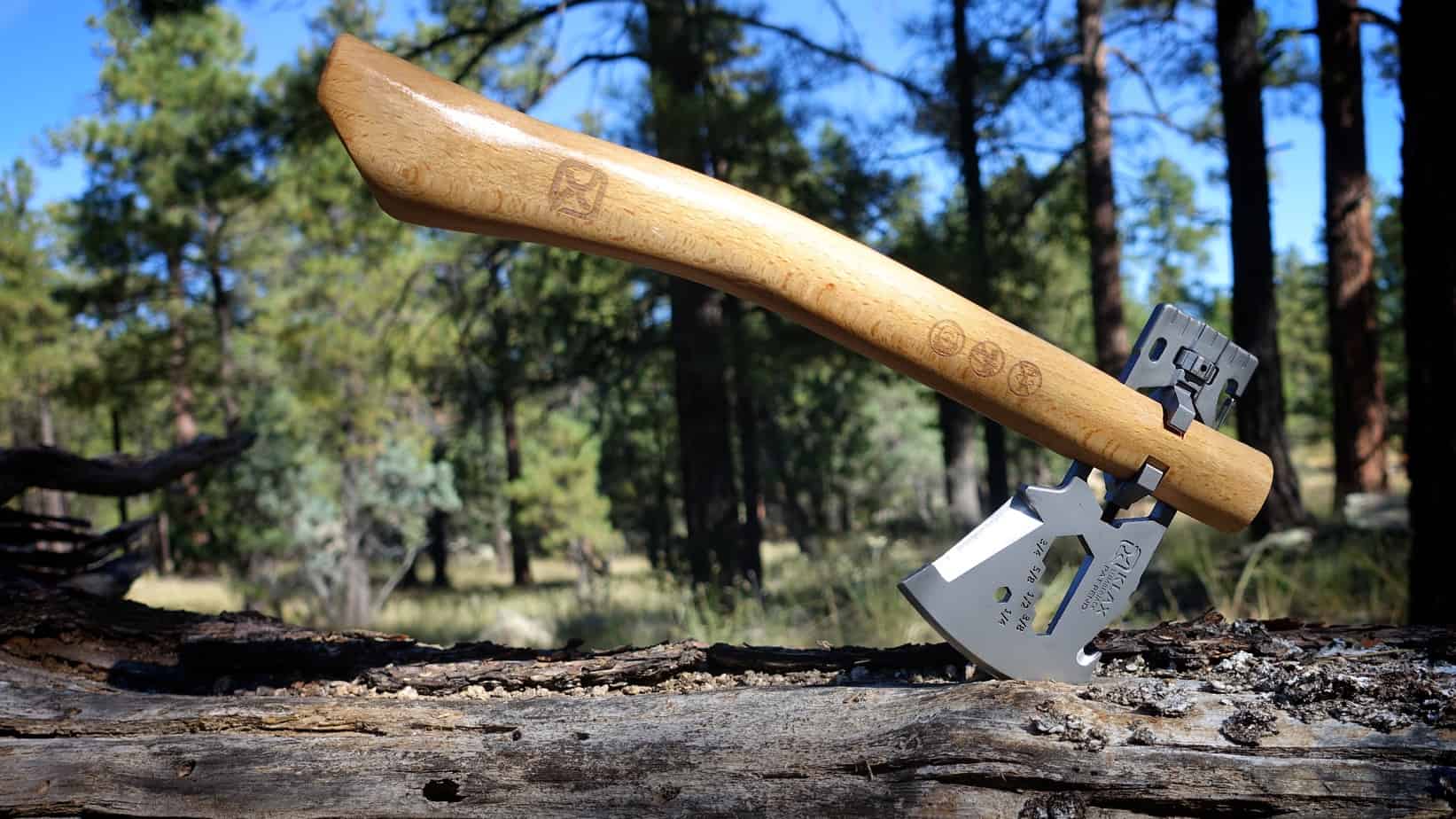 The Lumberjack model is constructed of machined stainless steel and features an axe edge, knife blade, hammer head, gut hook, five hex wrench indents, bottle opener, lanyard hole, ruler, and even a carabiner clip for easy transport. The axe edge even doubles as a curved ulu knife, a popular cooking tool.