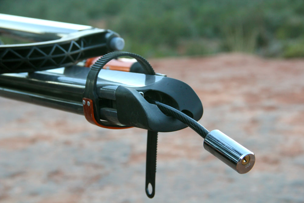 Hitch racks come in a variety of formats and the Küat NV uses a front wheel clamping mechanism to secure the bikes. This popular style of rack loads quickly and accommodates a wide range of wheel sizes and bike shapes. It also doesn’t require any part of the rack to contact the bike frame, which is an appreciated bonus for fussy bike owners like myself. To load the rack, the user simply places the bike on the full length tray, slides the wheel clamp down and against the front tire, and then secures the rear wheel with the small buckled strap. The entire process to load two bikes takes all of one easy minute. Once the bikes are in place, two retractable locking cables slide out from the bike trays and provide just enough length to thread through the bike frames keeping would-be thieves looking for easier targets.