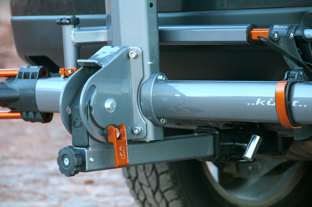 One of the challenges with any hitch rack is the interference they create with rear gate access. To alleviate this concern, the NV employs a simple tilt-down feature to move the rack away from the rear of the vehicle. Tilting the rack downward with two bikes loaded is not a problem, and returning it to the upright position is easier than expected. When the rack is empty, the NV can be folded virtically against the rear of the vehicle as to not have it dangling out into space waiting to get crunched.