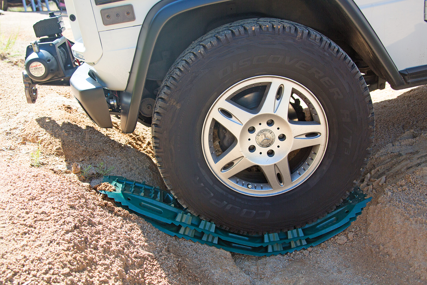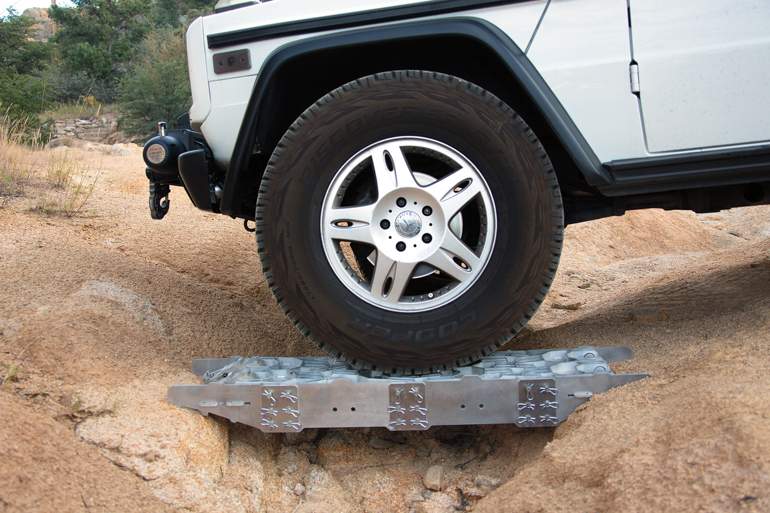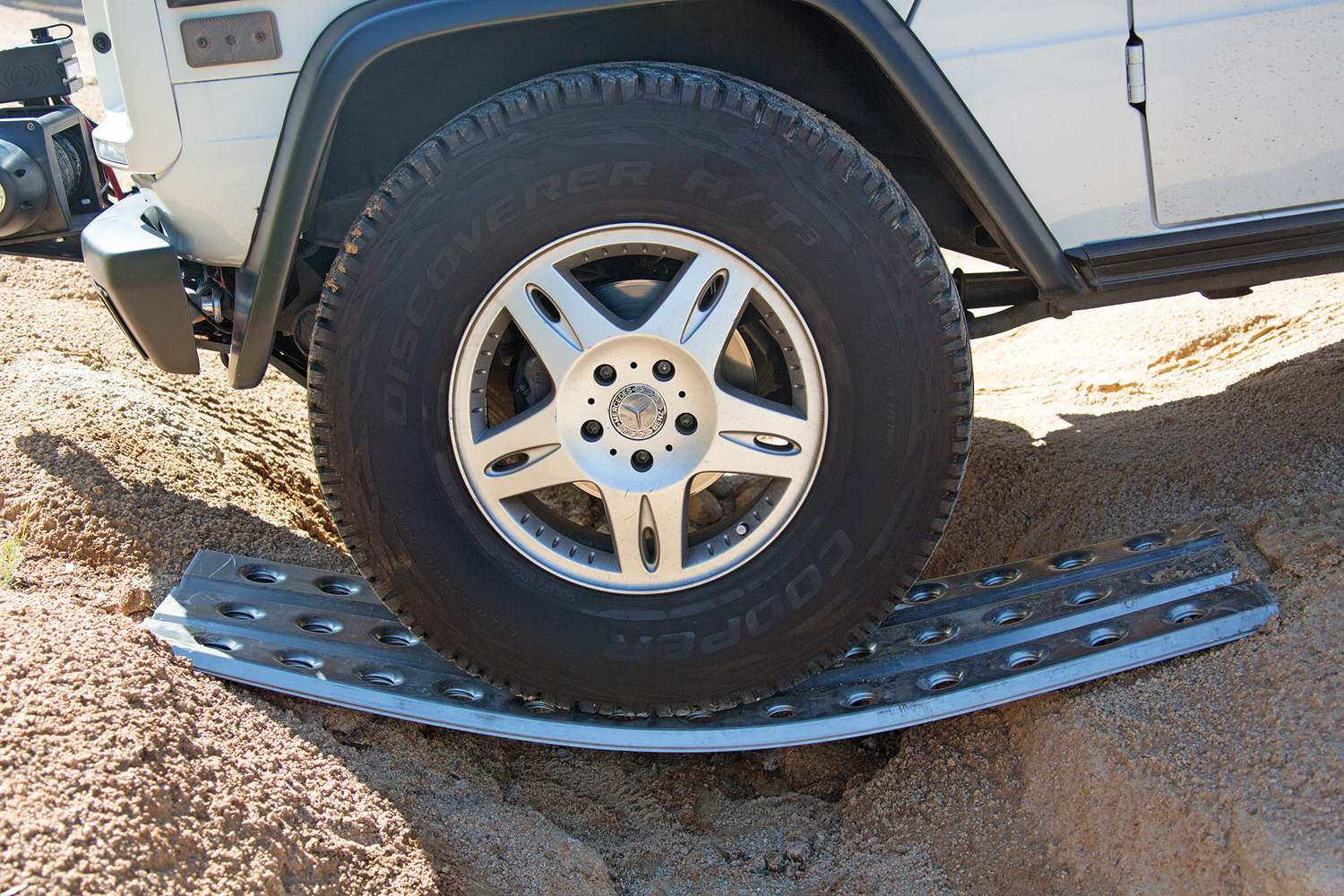 The soft surface test was the most important, as it represents the most likely situation travelers will encounter. Sand on a beach or a muddy trail back to a favorite campsite—getting stuck can happen just about anywhere. The cinders proved to be a better surface than I had hoped and we were able to get a predictable control, the heavy G-Class spinning the passenger front tire and the suspension fully extended. It asked a lot of the products: one failed the test entirely, while others clearly demonstrated their limitations. This test proved the critical attribute of a ramp profile and the need for the tool to be rigid. The less rigid the plank, the more likely it would get pulled through by the tire and fail the test. It also showed the necessity for strong, well-placed studs on both the ramp and the flat surface of the product.