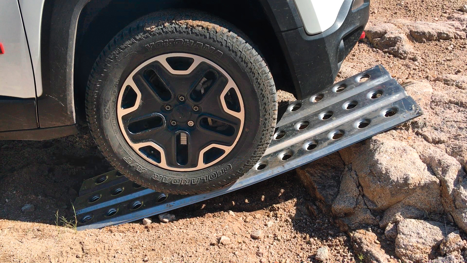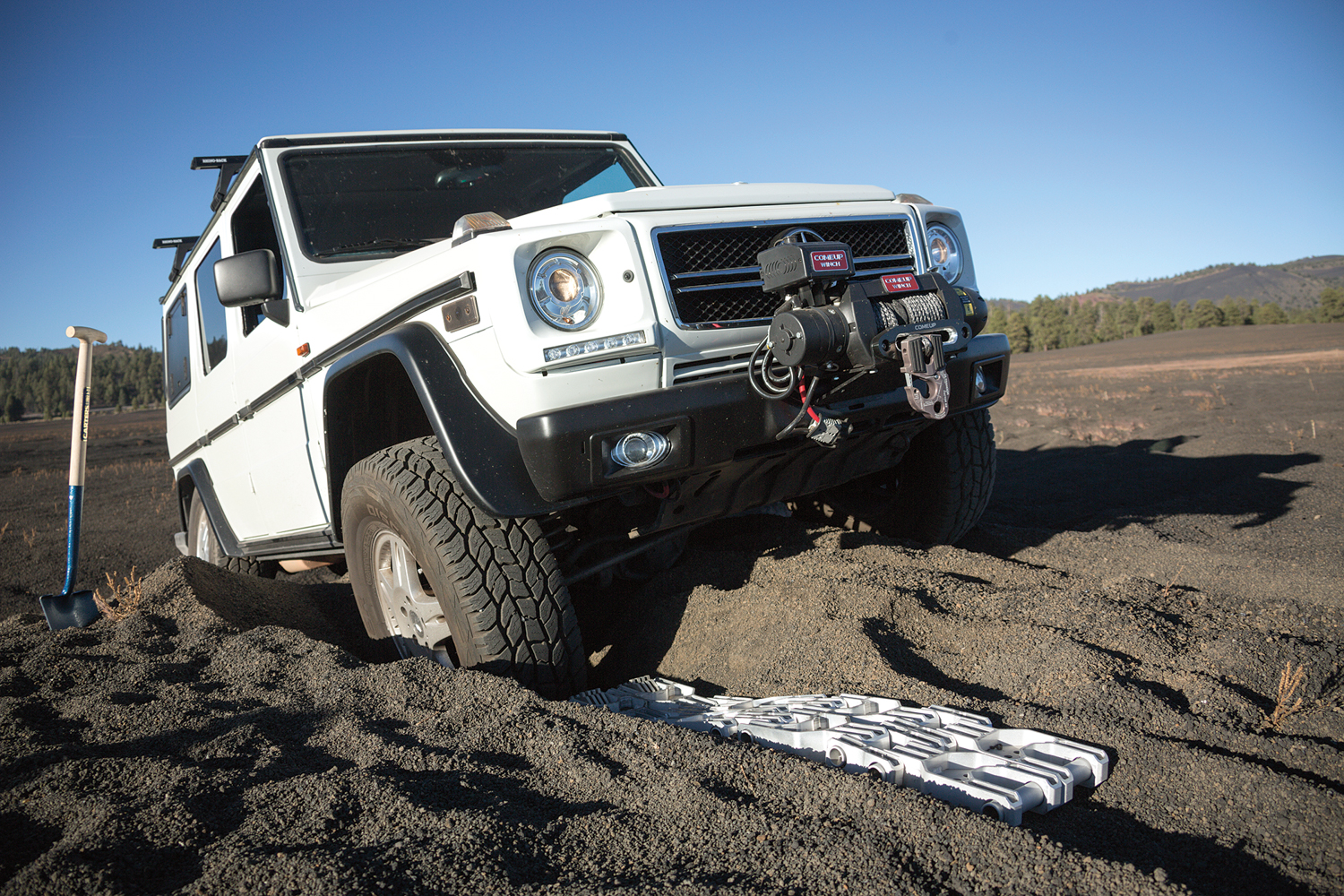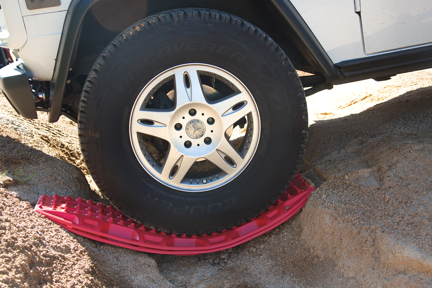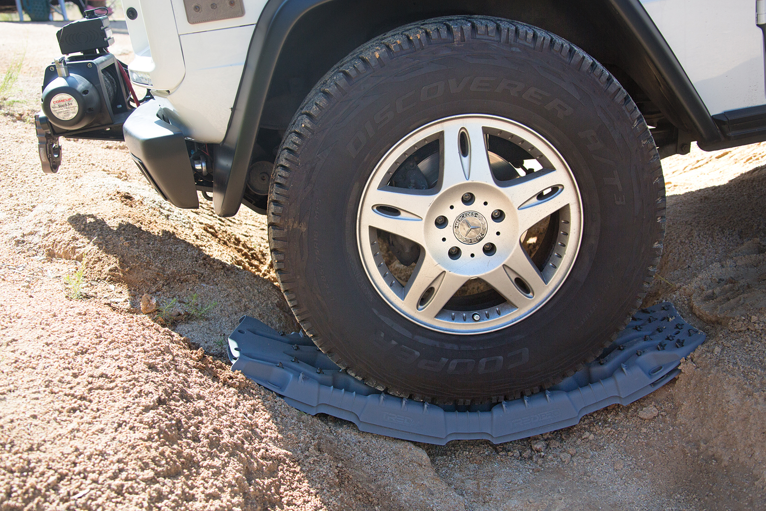 The soft surface test was the most important, as it represents the most likely situation travelers will encounter. Sand on a beach or a muddy trail back to a favorite campsite—getting stuck can happen just about anywhere. The cinders proved to be a better surface than I had hoped and we were able to get a predictable control, the heavy G-Class spinning the passenger front tire and the suspension fully extended. It asked a lot of the products: one failed the test entirely, while others clearly demonstrated their limitations. This test proved the critical attribute of a ramp profile and the need for the tool to be rigid. The less rigid the plank, the more likely it would get pulled through by the tire and fail the test. It also showed the necessity for strong, well-placed studs on both the ramp and the flat surface of the product.