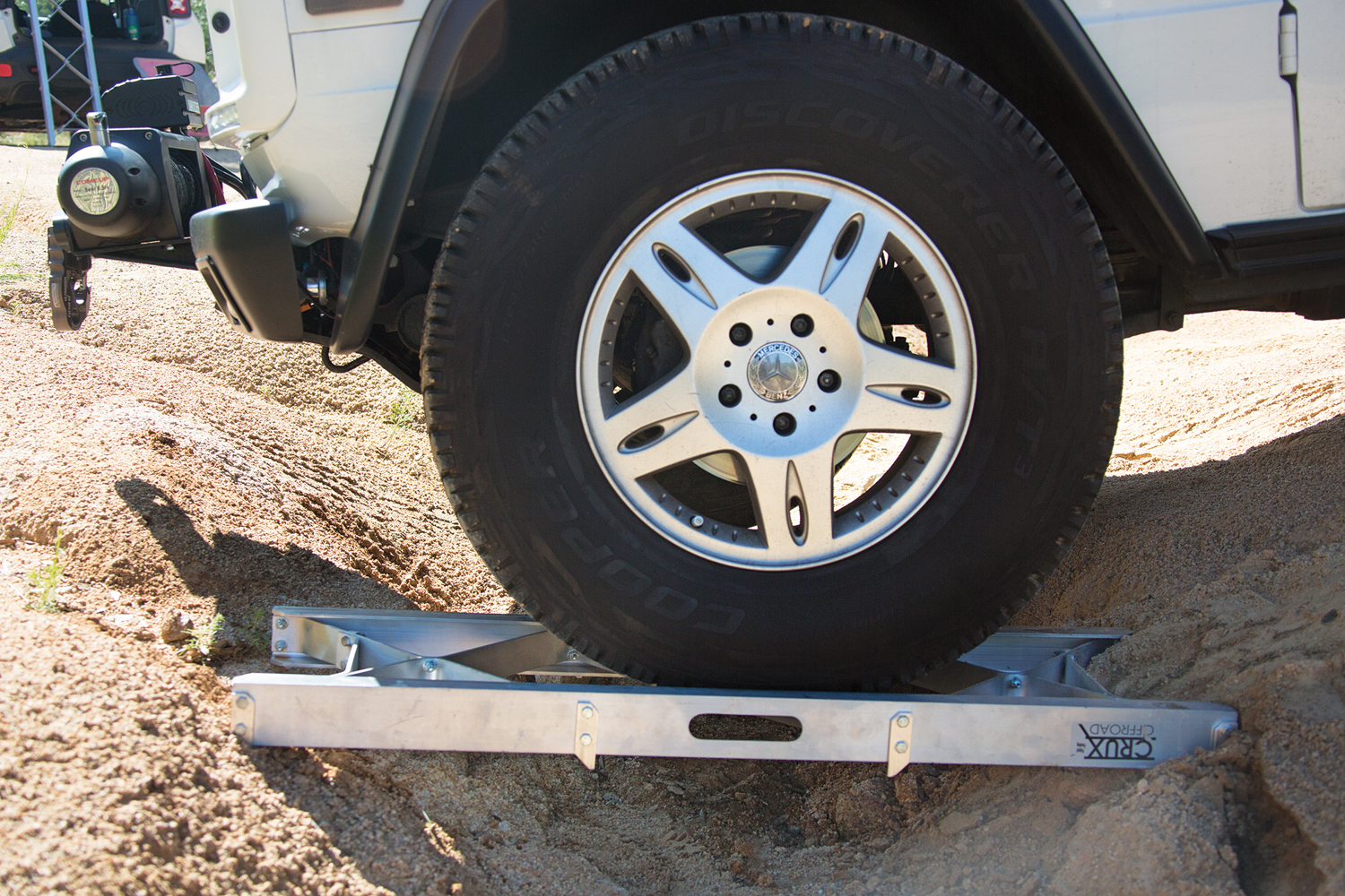 On ramping, the Crux performed the best again, staying the most securely positioned on the rock and dirt, while easily aiding the vehicle over the obstacle. The Smittybilt slid out immediately, and while the Tred Pro certainly helped the vehicle ascend the obstacle, the shovel end often sent the ladders flying. The Maxtrax performed the best of the nylon products. The Mantec PSPs performed admirably, scoring a successful result and not kicking completely out of place. The LinkTrac without the bridging rails failed the test, being pulled through by the tire immediately. With the rails, it performed similarly to the Crux and Mantec, a successful climb. However, we noted that even though the Link- Trac had vertical load strength, it suffered in torsional rigidity. The uneven surface of the ledge caused the base to twist and not return fully to square.
