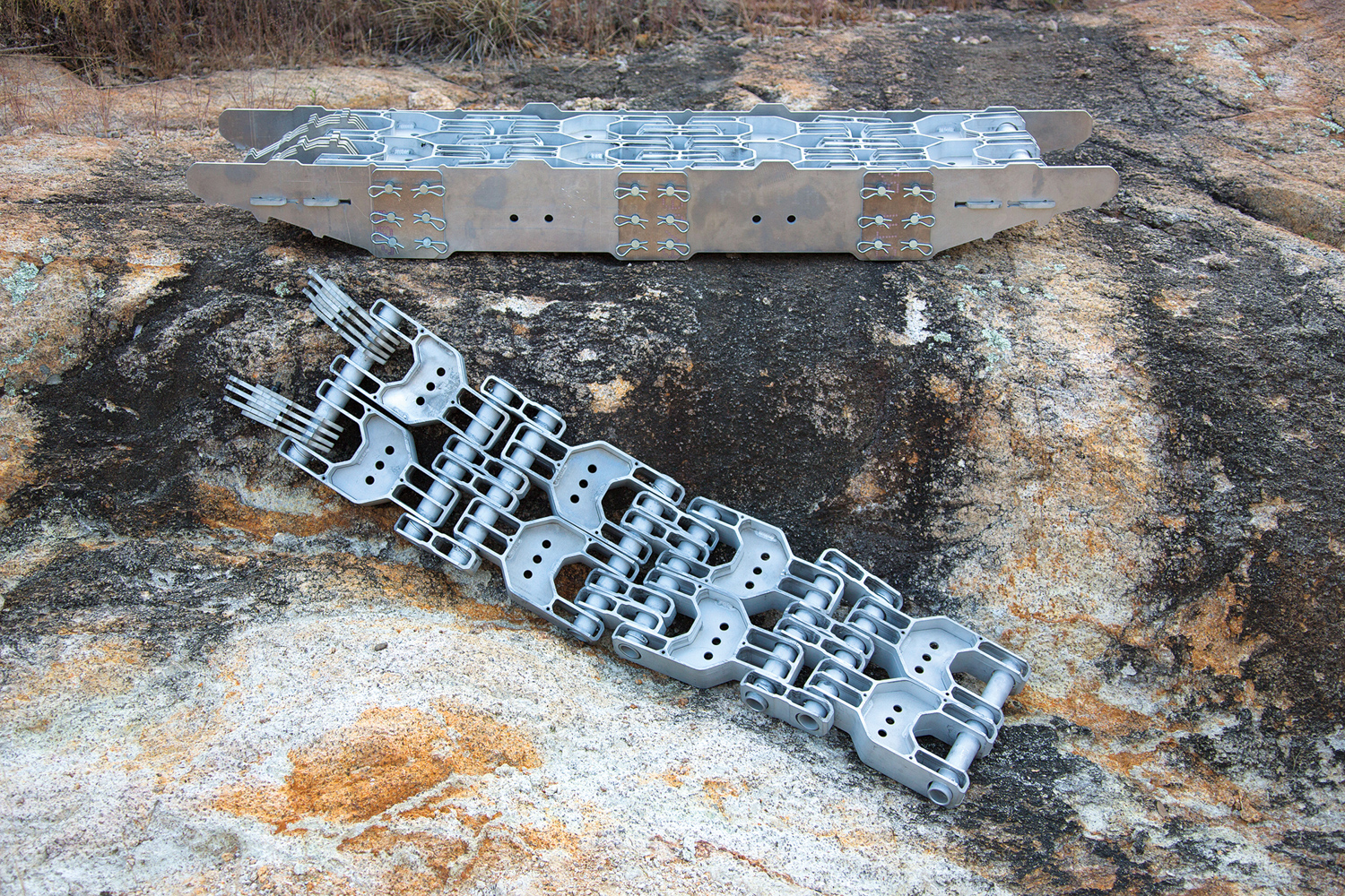 With optional bridging rails, this product is the most versatile of the test, providing either a flexible or rigid solution and the ability to span a 50-plus-inch gap with a 5,000-pound single wheel load. It is also the heaviest entry of the evaluation at nearly 100 pounds per complete pair. The track is produced from 6061-T6 aluminum, the primary links extruded and then fitted with welded plates for rigidity and additional flotation. Large cross tubes slide through the mating pieces and the links, providing the ability to extend the length indefinitely, but also replace damaged components in the field. Surface traction relies on the profile of the extrusions and adhesion, but there is also the opportunity to install ice screws if required. The bridging rails can be field-assembled for compact storage and use a set of 1/4-inch plates, cross rungs, and joining pins. It takes about 10 minutes to put each base together, but the benefit is that the pieces can easily be stored in a drawer until needed.