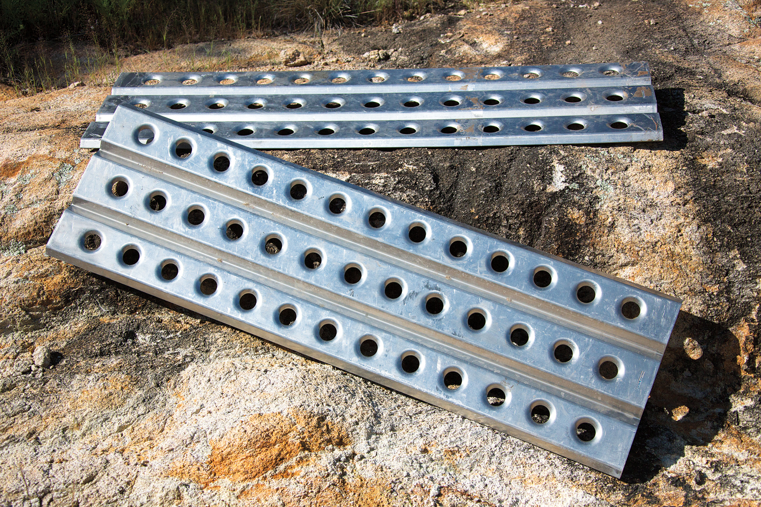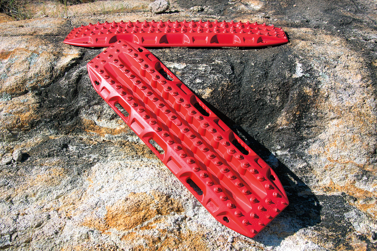 Few pieces of kit look as overlandy as a pair of Mantec PSP sand tracks bolted to the side of a Defender’s Brownchurch rack. Only minimally revised from the design of the Marston planks, these 4-millimeter-thick aluminum units are a full 5 feet long and can easily double as a litter for an injured traveler. They lack the interlocking tabs of the original runway matting, but retain the perforated holes, reinforcing channels and bends. These units performed well in our 2009 test, taking the Editor’s Choice Award because of their exceptional all-around functionality and suitability in sand. New technology and better options have come to challenge this old stalwart though.