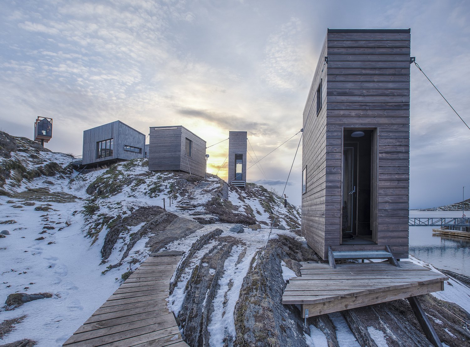 The coast of Norway is dotted with ethereal clusters of islands, remnants of the last glaciation that blanket the mainland like a protective barrier from the icy Norwegian Sea. This windswept landscape of rolling hills and countless fjords is an explorers’ paradise of spectacular beauty and makes an especially stunning backdrop for a cluster of modern tiny dwellings known as Fordypningsrommet Fleinvær or The Arctic Hideaway.