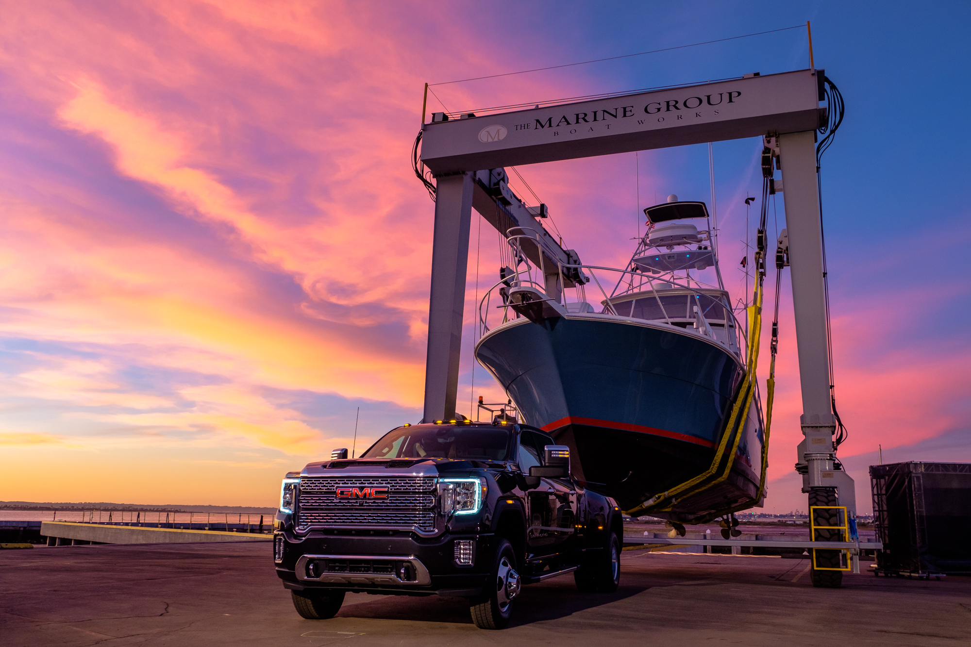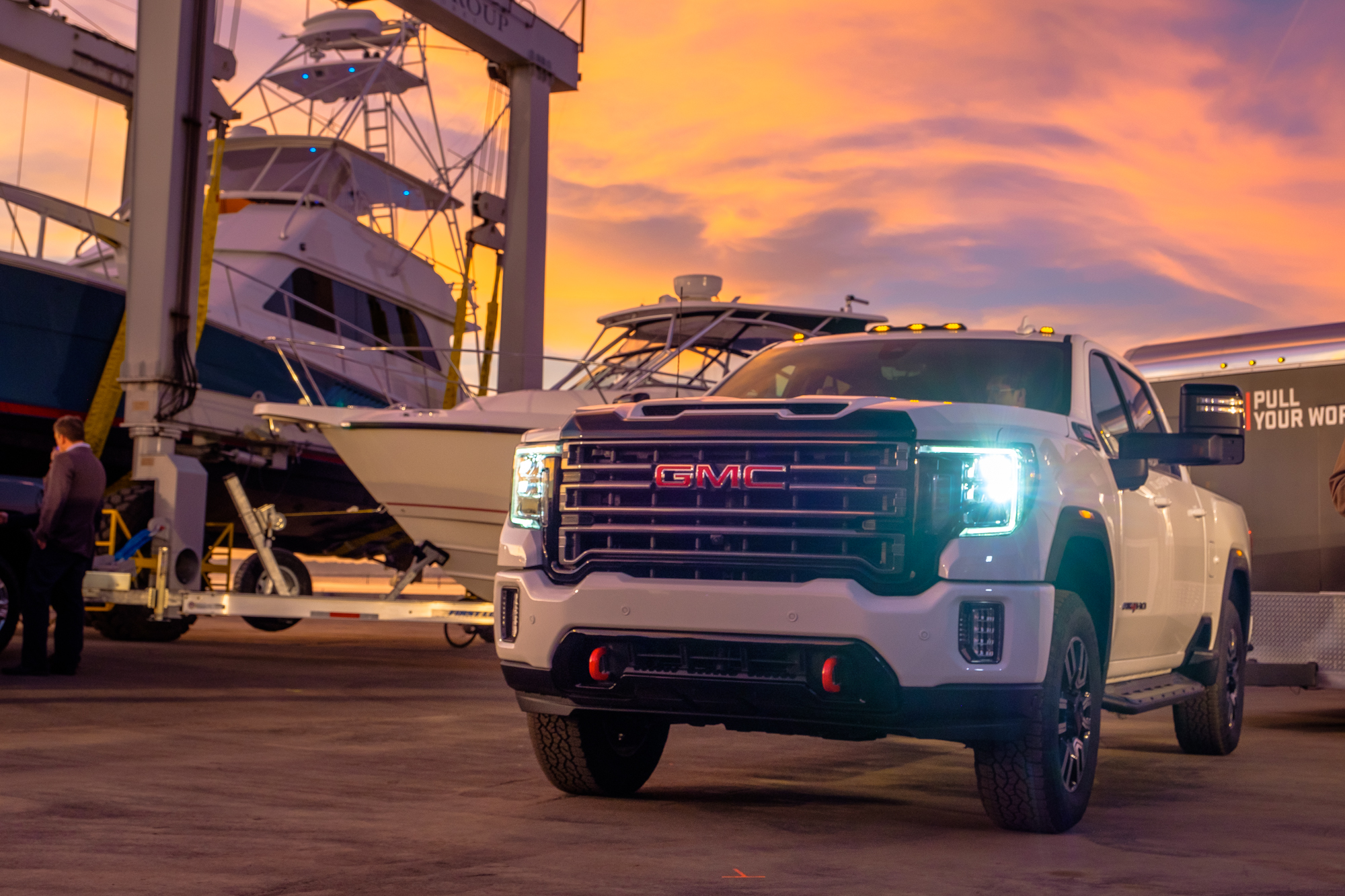Just a few hours ago GMC revealed their all-new HD lineup on the shores of sunny San Diego, and they opened up the event in a big way, a very BIG way. Since towing is one of the main focuses of their HD line, they decided to roll out the 3500 HD Denali with a ridiculous 225,000 pounds hooked up behind it, in the form of an 80-foot boat and travel lift. For those wondering, that’s a good deal more than the Space Shuttle. Although that is clearly well in excess of the towing limits, which will be more than 30,000 pounds, it does prove the durability and amazing capability of the platform. Yet there is more to see than just big power and payload numbers this year. That’s because the HD line now boasts an entirely new AT4 segment, improving the product’s off-road prowess without sacrificing its utility.