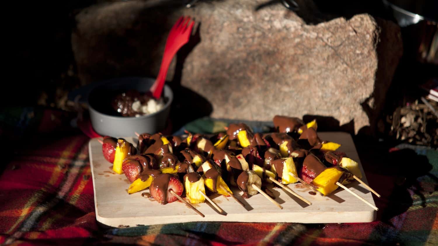 Summertime is the only season when I don´t feel the urge to gulp down a rich dessert—it´s too hot to be hungry and too fun outside to be stuck indoors. Fruit is a light and refreshing dessert alternative, but if you’re craving something different, put the fruit on skewers and throw them onto the campfire, then top off with two delightful chocolate dips. It´s a recipe so delicious it will make your fellow travelers beg you to join them on the next trip.