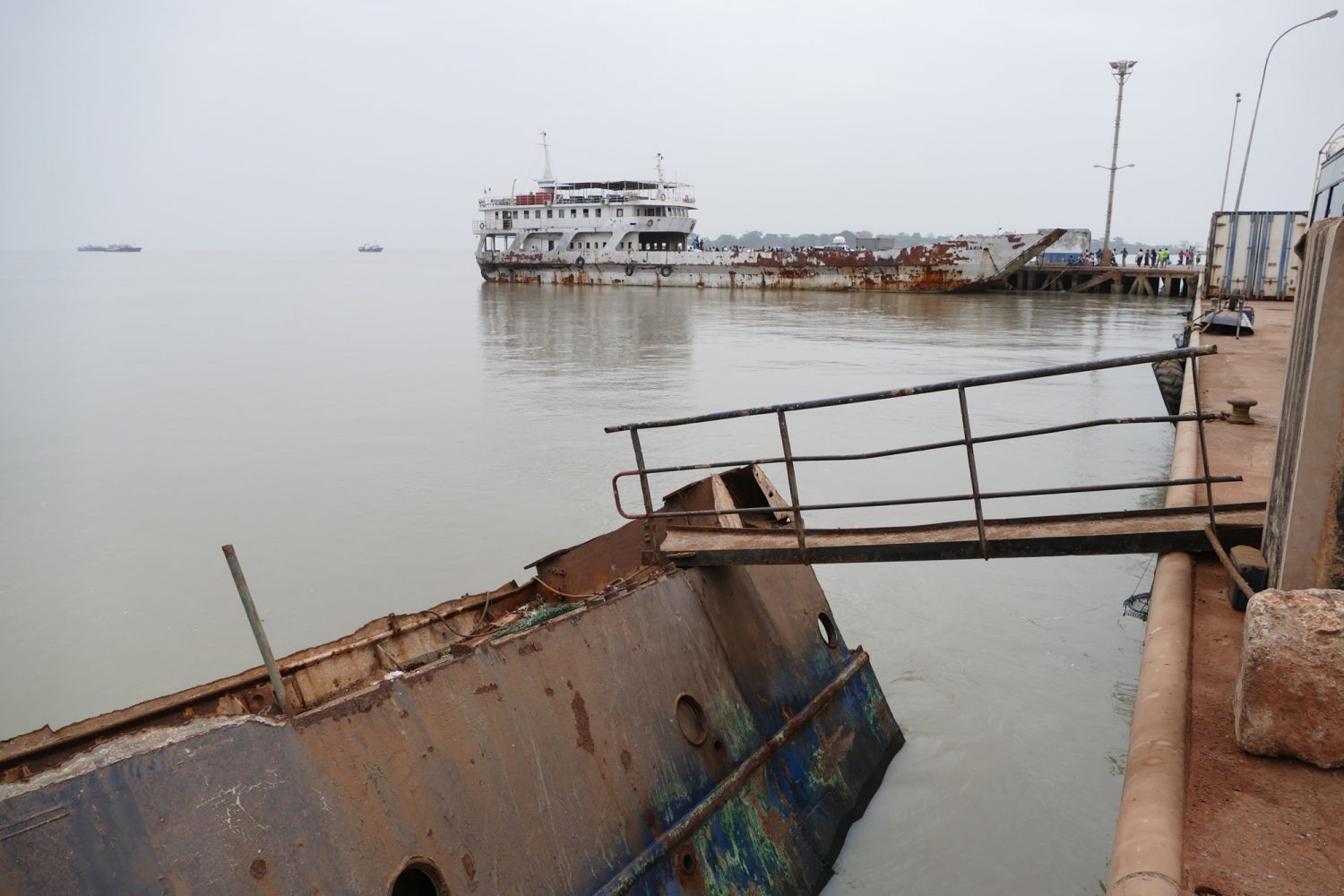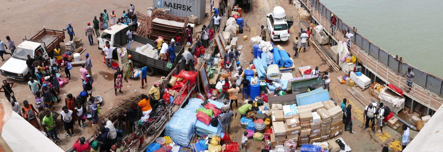 We watch the hustle and bustle while they are loading the ferry. Chickens, squealing pigs, fuel, building materials, cookware to prepare the fish that will be sold in sandwiches later—everything goes on the ferry. First, everything is loaded onto one side. The main thing is to take the shortest way over the rail, as everything in the usual African “order.” Why don’t they open the front hatch to load the goods? That will remain the captain’s secret forever.