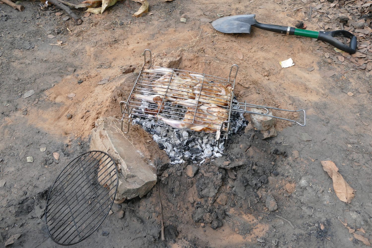 We start preparing hot water to pour over the chickens. This makes it easier to pluck the feathers. Some ants have already discovered the feathers for themselves and drag them away. At about this time, our chicken delivery man comes back on his moped to ask if he should slaughter the chickens for us. Very nice, but too late.