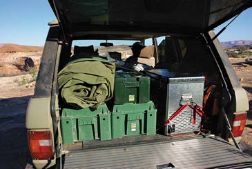 Those who have listened to my lectures and classes will know that I consider a fridge to be the first and most important living space addition to any overland vehicle larger than a Smart Car (I’m still not convinced on the Smart Car). I decided to follow my own advice—a National Luna Weekender was soon sitting in the back of the Range Rover. This is the same fridge that won Editor’s Choice in our recent fridge review (Overland Journal, Summer 2010) and started its long-term testing life by being abused in a three-week, no re-supply, high-ambient-temperature experiment devised by Connie. No problems to report so far. Placement of the fridge required a few additions to the truck. Aviation track tie-down points, used in load bays of cargo planes, were fitted when the fuel tank was removed for the crash plate installation. The rear carpet was also removed and replaced with rubber mat; the tailgate received the same treatment.