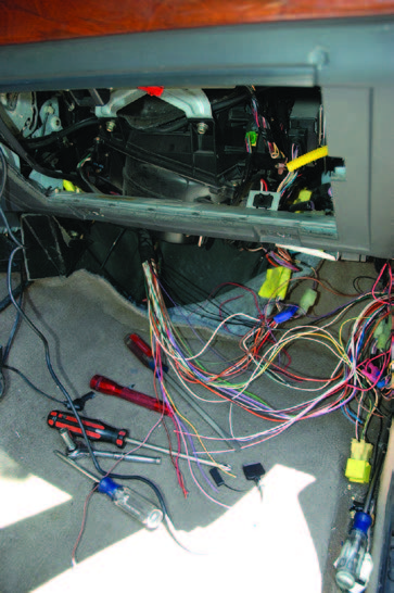 The electronics for the engine conversion take some work. All the engine management electronics, including the ECU go away. The new engine harness is made up of exactly six wires: starter solenoid, oil pressure, temperature, alternator, tachometer, and the ignition coil wire (which becomes the fuel solenoid wire on the diesel). For the transmission, the reverse lights have to be separated from the transmission harness and run to the correct position on the R380. The wires for the park/neutral position switch have to be connected so that the car will start, since on an automatic starting is disallowed if the transmission is in any position other than neutral or park. We pulled all the other wires on the engine harness except the air conditioner switch and a few power lines, which will be used for accessories later. After the conversion, Keith was able to source a 300tdi air conditioning kit, which included the compressor, idler, adjuster and the belt. All have been added to the engine, but the lines have not been completed yet.