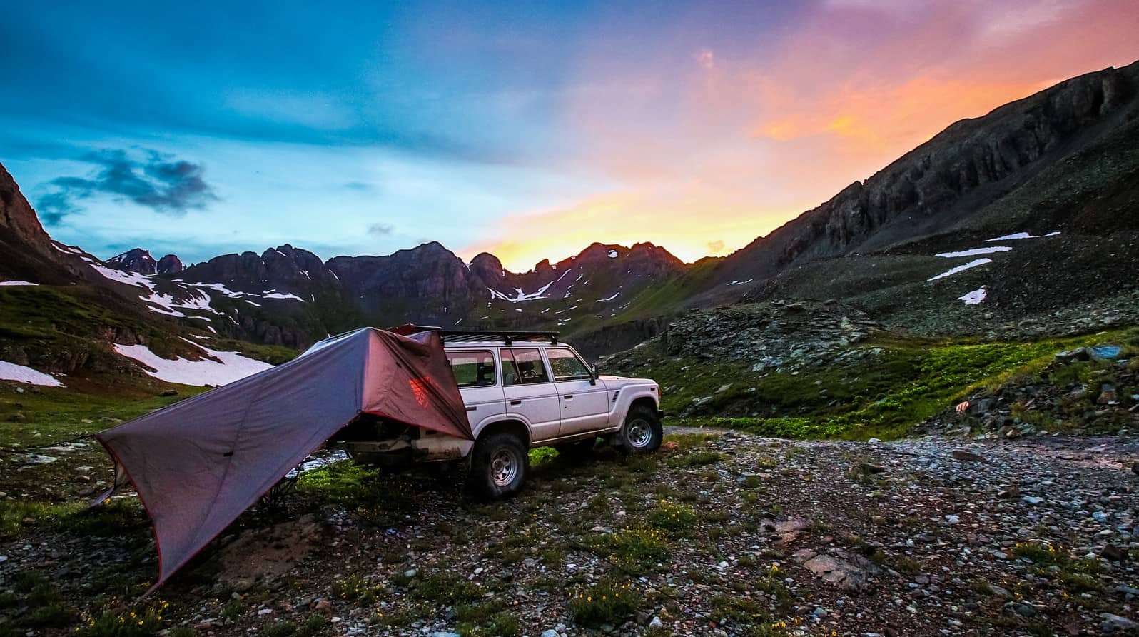 By noon Sunday burgers and a pint were had at the Ouray Brewery while James and I studied the maps for Engineer Pass. By this point we were both getting leery of the trip reports we had read from others. Not that the FJ60 was having any trouble, or the roads were beyond our comfort levels, but the reports claimed things such as Subaruable for Imogene; Bollocks. That said, the only trouble we had getting to Engineer Pass was convincing the Range Rover Sport driver and his friends in their side by side to reverse 20ft up the trail rather than our reversing a quarter mile down the trail. Personally I feel it should be a flexible thing based upon location of pullouts but if they are reading this; No, the rules of the road aren’t randomly different in Colorado, those going uphill do have right away. After the short detour to Engineer Pass, we returned to the large mine near Mineral Creek for the night. Again camping in an old mine cabin we moved in before the rains began, enjoying our drinks of choice with our pipes. Soon the sun was setting with a spectacular double rainbow over camp and a light sun-shower.