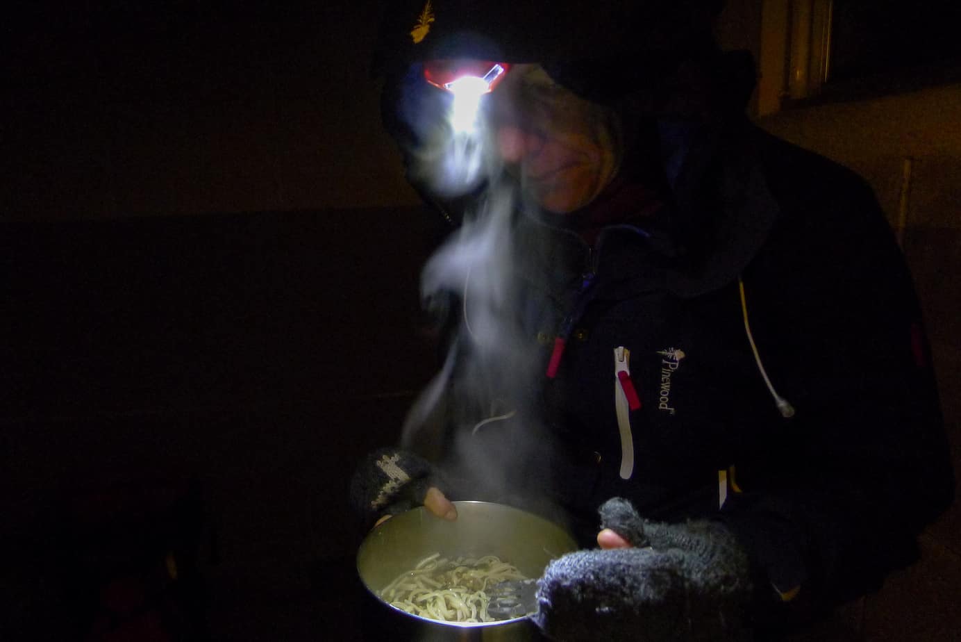 If only the day had had more hours of light so we could have taken it slower, including more stops to enjoy views. However, darkness fell. For an hour we hiked with our headlights on. To say we were relieved to reach the shelter is an understatement. I didn’t even register whether it was made of concrete or wood, whether it was beautiful or ugly. It was empty and protected us from the elements, no matter how cold it was inside. We put on all our clothes and cooked while wrapped in our sleeping bags. While we were having a restless night, the weather gods debated and concluded there had been enough snow. When we woke up it was raining.