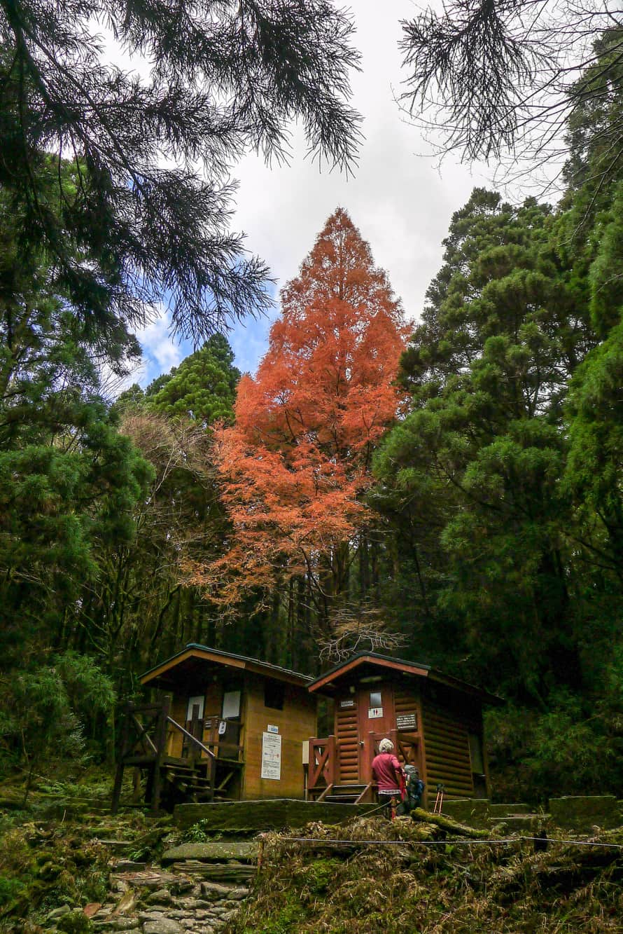 By the time we reached our shelter, the sun had disappeared behind the mountains and temperatures plummeted. We put on all our clothes, including woolen hats, but lacking winter jackets we had brought our rain jackets. The hut was an ugly concrete structure but served us well. In Japanese houses, you take off your shoes before entering and here it was no different. In the center was a wooden platform, for socks only; shoes stayed on the concrete floor. According to the guestbook it was busy in July/August, but during the rest of the year this shelter was not much visited, least of all in December. The one other visitor hid himself in one of the four rooms with bunk beds and was not interested in socializing.