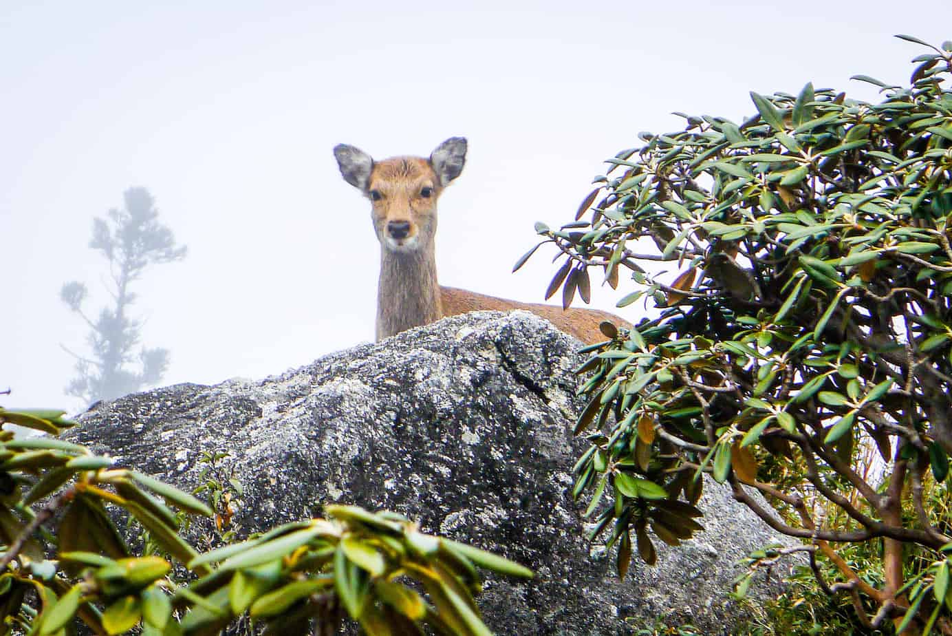Once we hit the snow, the real work began. Rocks became slippery and as the dark soil disappeared underneath a layer of white, we watched our every step. On day 3 we got into more serious snow hiking. With the trail often invisible, our feet and legs often slid off the side, deep into the white powder. We left the forest below us and climbed higher to the top of the mountain with views of slopes covered in thick snow. Under the clear blue sky, the sun beat down on us. We stripped down to our shirts and sweated with the effort of our climb. While monkeys retreat to the warm coast in winter, Yaku deer didn’t seem to be bothered at all by the snow. The small deer were easy to spot and not afraid of our presence. We could approach them to within a few meters. Some followed us with what seemed a curious look, others continued their search for something to eat.