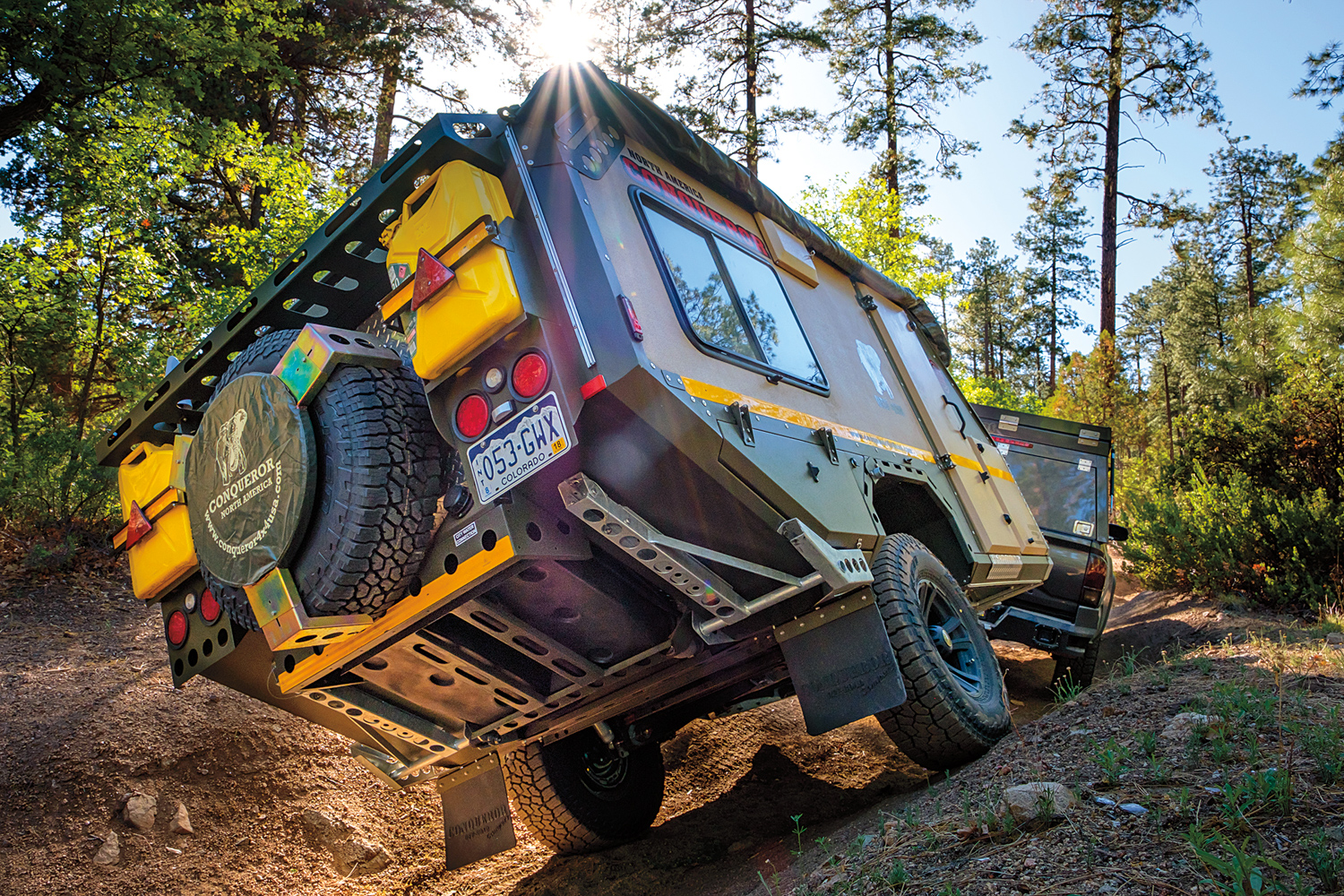 The Conqueror was a joy to tow on the road, the perception of nimbleness and ease of maneuvering belying its dimensions and weight. Much of this is due to the design of the suspension and the positive, rattle-free connection of the Max Coupler. To say that the suspension is plush would be an understatement— the UEV-490 floats over bumps, bridge expansion joints, and broken asphalt. However, this compliant ride did result in more body roll than desired, but the large diameter Tough Dog shocks did an adequate job of minimizing sway. The brakes are also highly effective on both pavement and trail, with the large surface area of a 12-inch drum. The track width was a perfect match to our Tacoma tow vehicle and would pair nicely with most SUVs like the 4Runner, Grand Cherokee, and Discovery. Unfortunately, the gross vehicle weight (GVW) of 4,000 pounds makes the 490 too heavy for any variant of the Jeep Wrangler.
