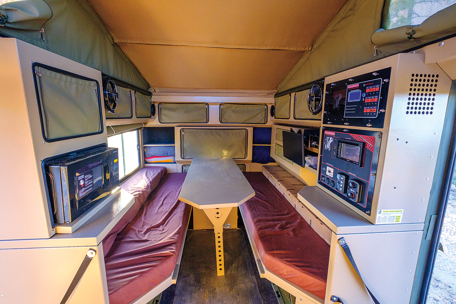 The UEV-490 was easily the largest and most luxurious model in our test. It bridges the gap between compact off-pavement trailers and true caravans, with more features than many of the others combined. Within its walls, you’ll find a flat-screen TV, a hot-water shower, air-conditioning and heating, a microwave, tons of outlets, and even a fan system that creates positive pressure in the cabin to prevent dust incursion while driving. The list goes on and on, yet it wasn’t any one of these features that set the Conqueror apart. That honor belongs to its design.