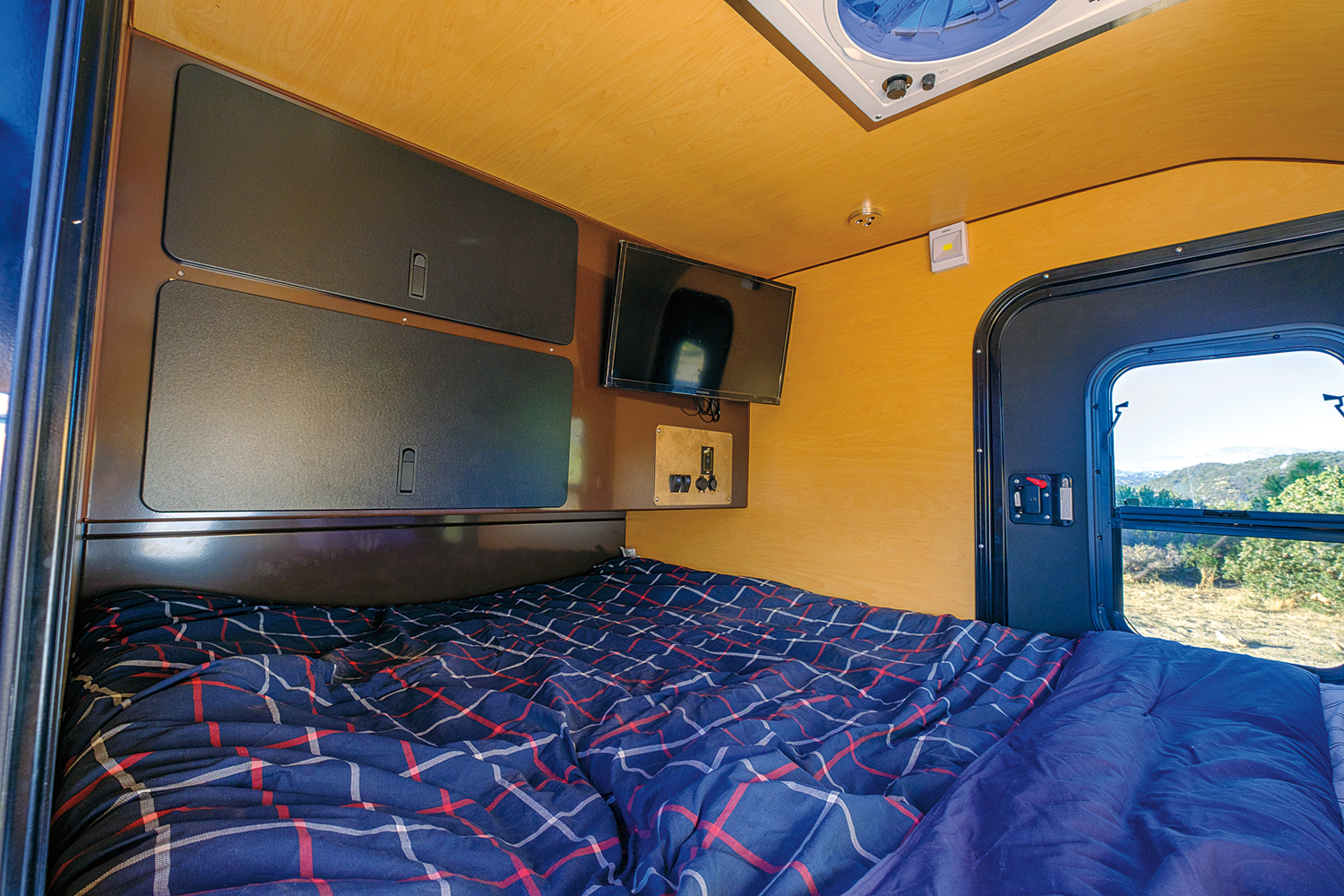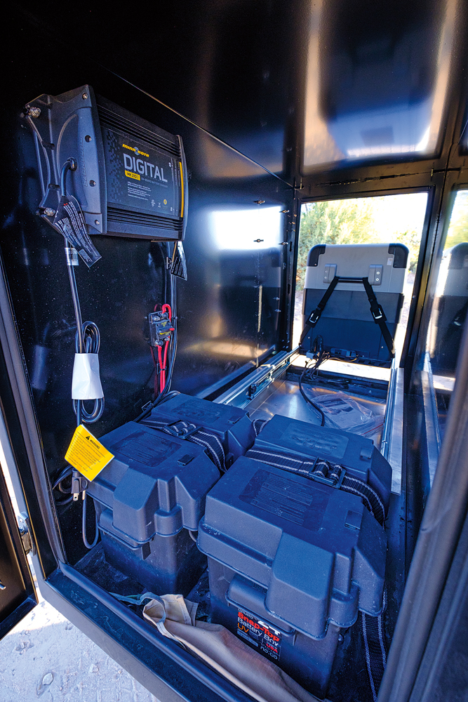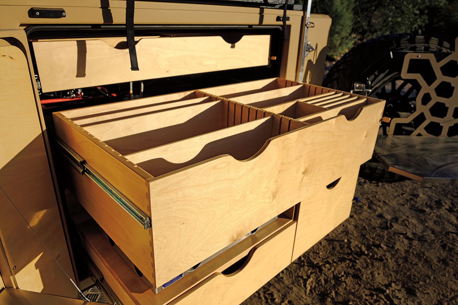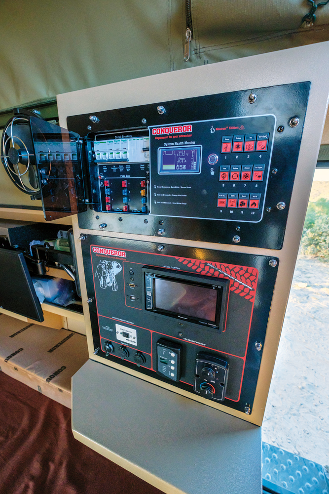 The stove, sink, fridge, and prep table are built onto heavy-duty slides and are 100 percent ready to use the moment you pull them out. There are gauges that monitor water levels in the tanks, the drawers and cargo compartment are lined with soft materials to prevent harsh impacts and rattles, and the stereo and electronics are easy to operate.