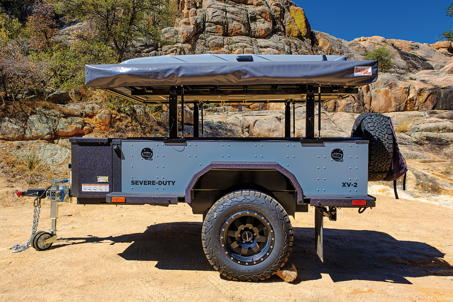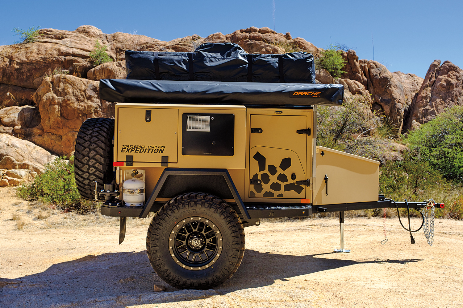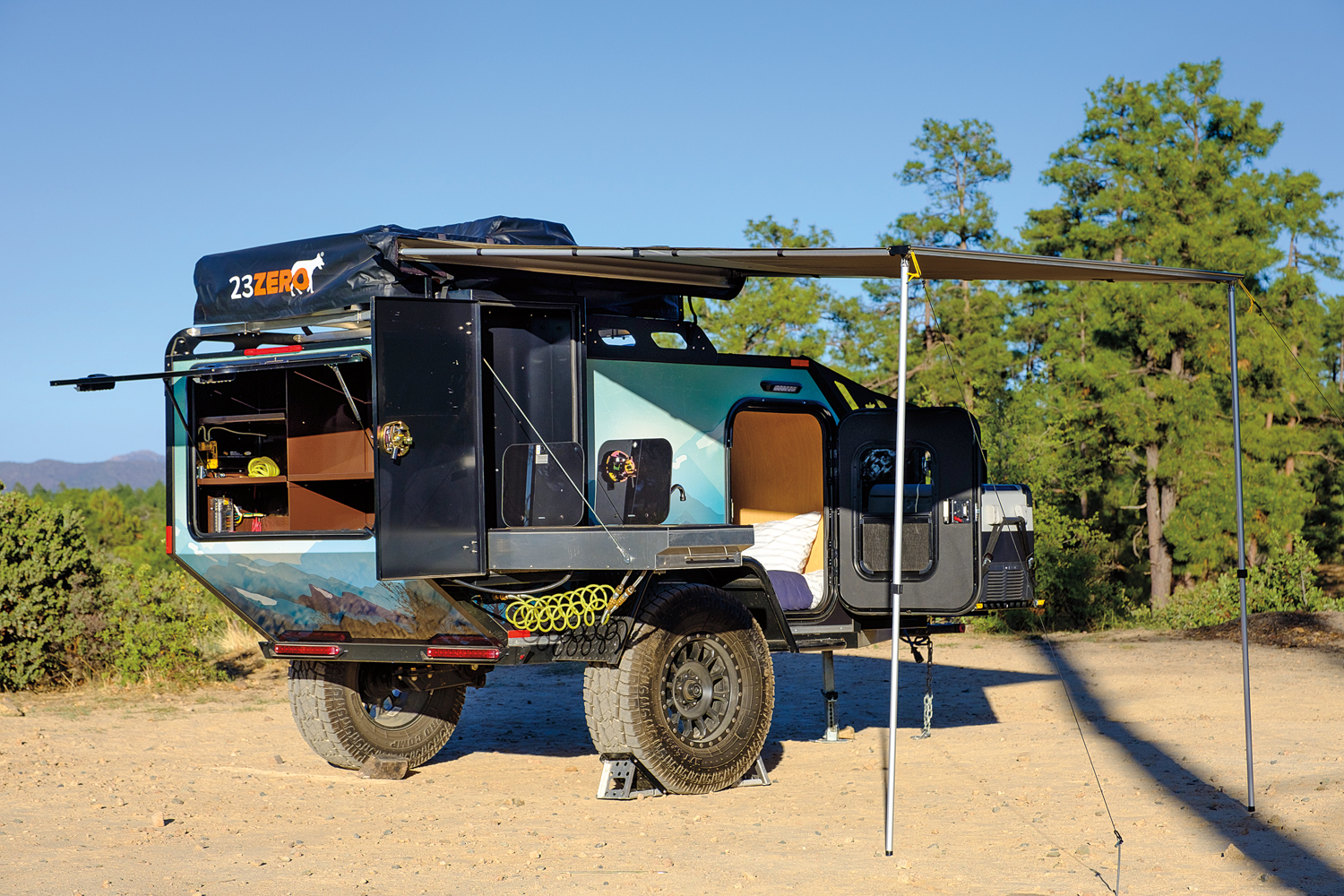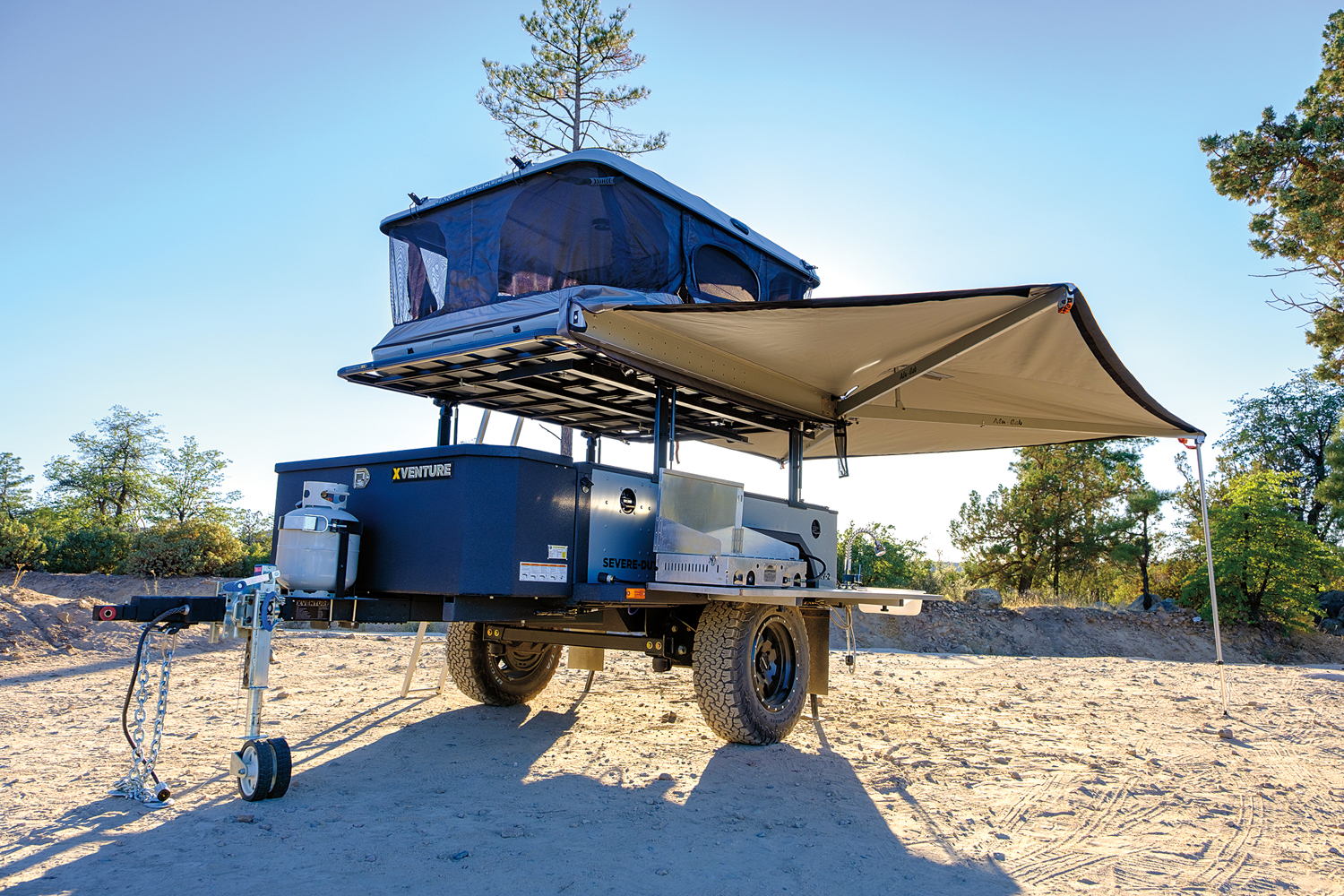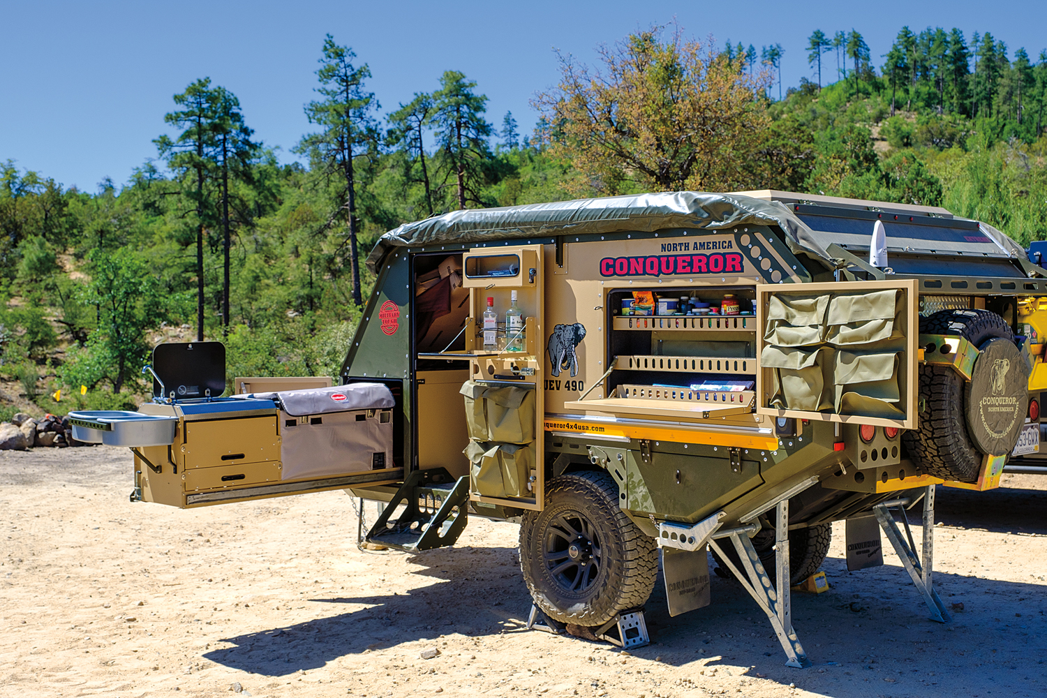 Their UEV-490 is particularly unique, and the one we selected for this test—a live-in and live-around unit—combines the best of camper living with expansive shade and outdoor cooking. It is also one of the few trailers on the market that is designed with abundant interior space, yet is still small and low enough to manage most trail conditions. Thoughtful features are found throughout, and nearly everything is included, down to cups, plates, and utensils.