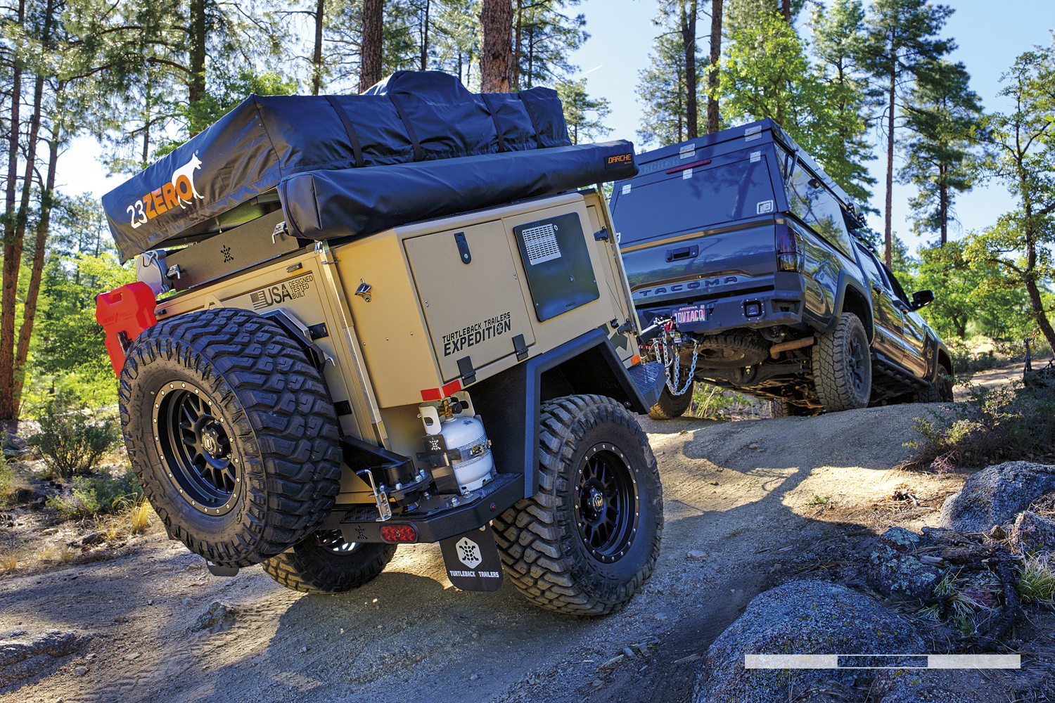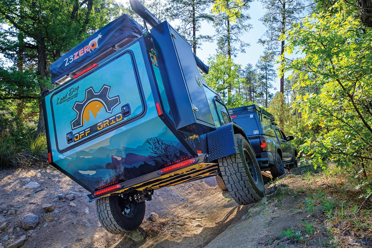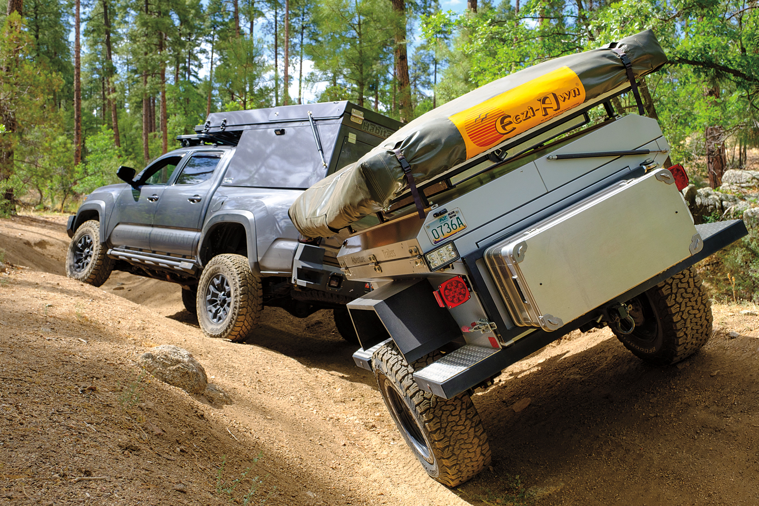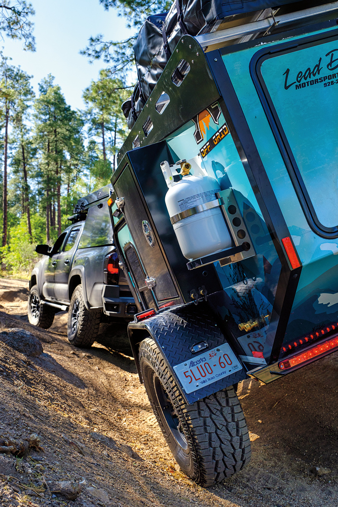 The testing process included a full inspection of the trailer and systems, followed by an initial trail test and photo shoot. Next came an on-pavement test loop that was complete with city driving, twisty roads, highways, and steep grades. This allowed us to consider highway speeds and maneuverability in traffic. For the trail, we used part of our long-standing test loop, a route that provides technical cross-axle ruts and erosion, aggressive approach and departure obstacles, and tight tolerances between trees. Here we measured traction control intervention and ease of towing through the deep gullies. We purposefully hit rocks and tree stumps with the trailer tires to evaluate suspension dynamics. And, we modulated the brakes to determine braking capacity and the ability of the driver to lock the trailer tires to allow for more advanced towing maneuvers. The last route included highspeed dirt roads with corrugation, washouts, embedded rock, and decomposed granite. This segment ended at a beautiful campsite that allowed us to time setup and compare camping comfort and support systems overnight.