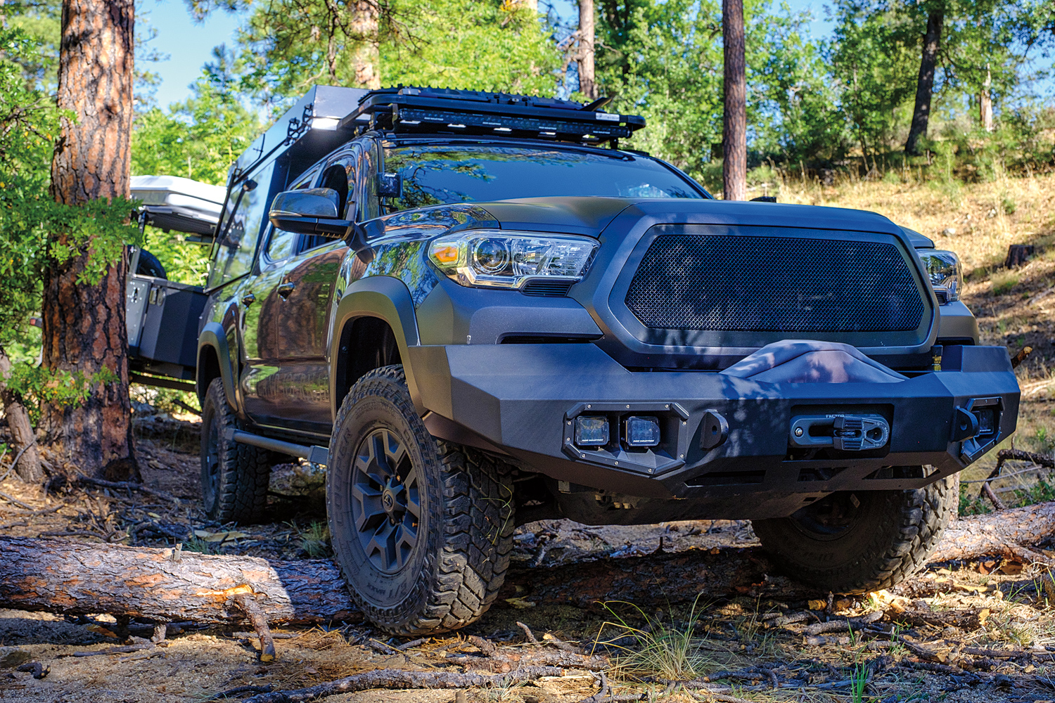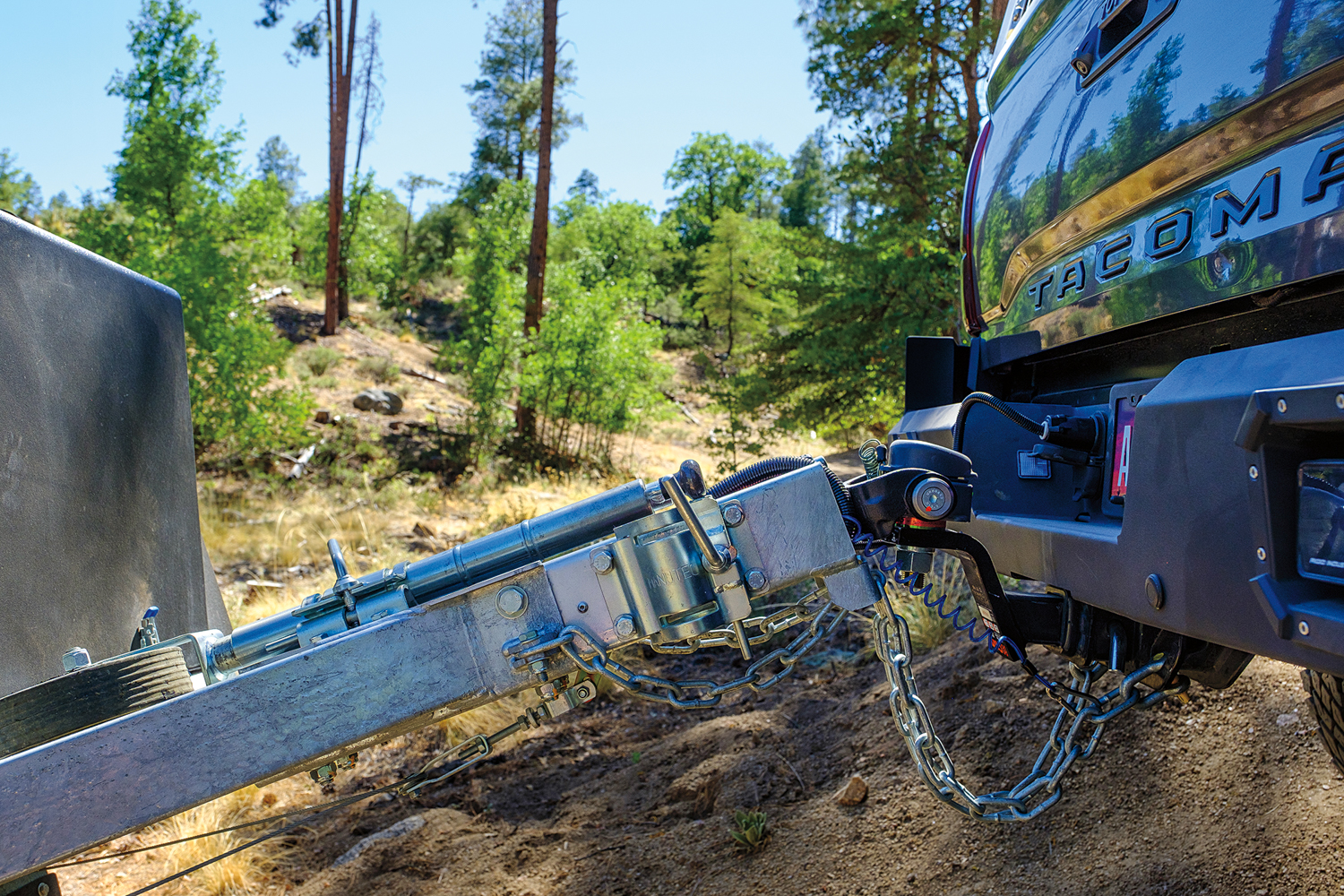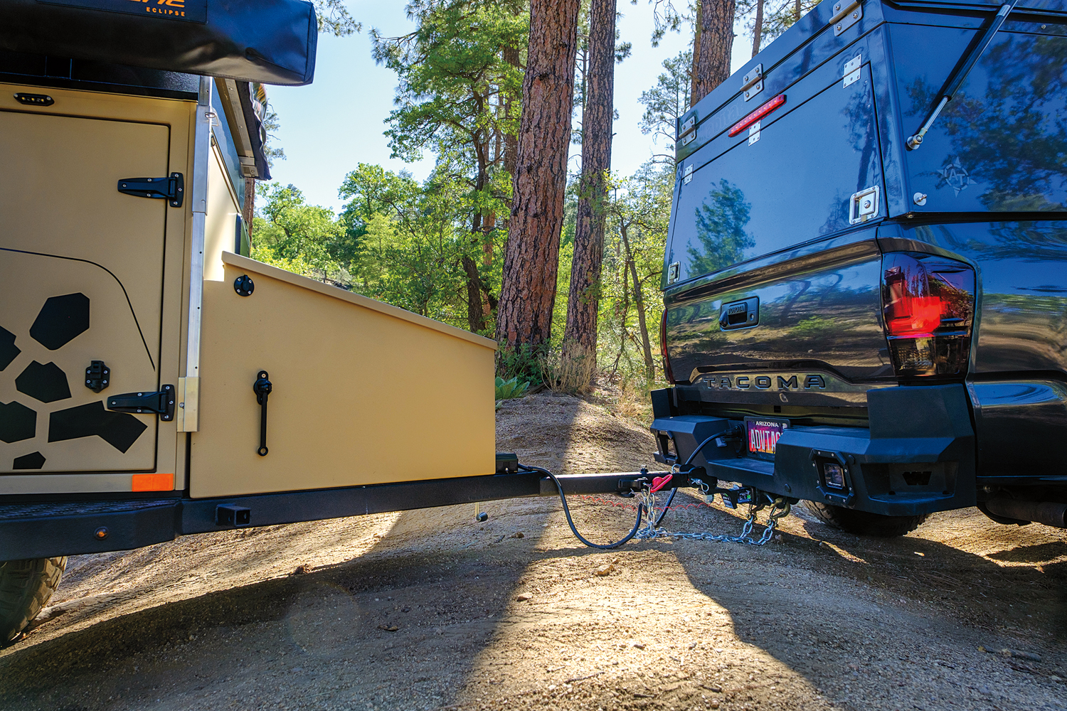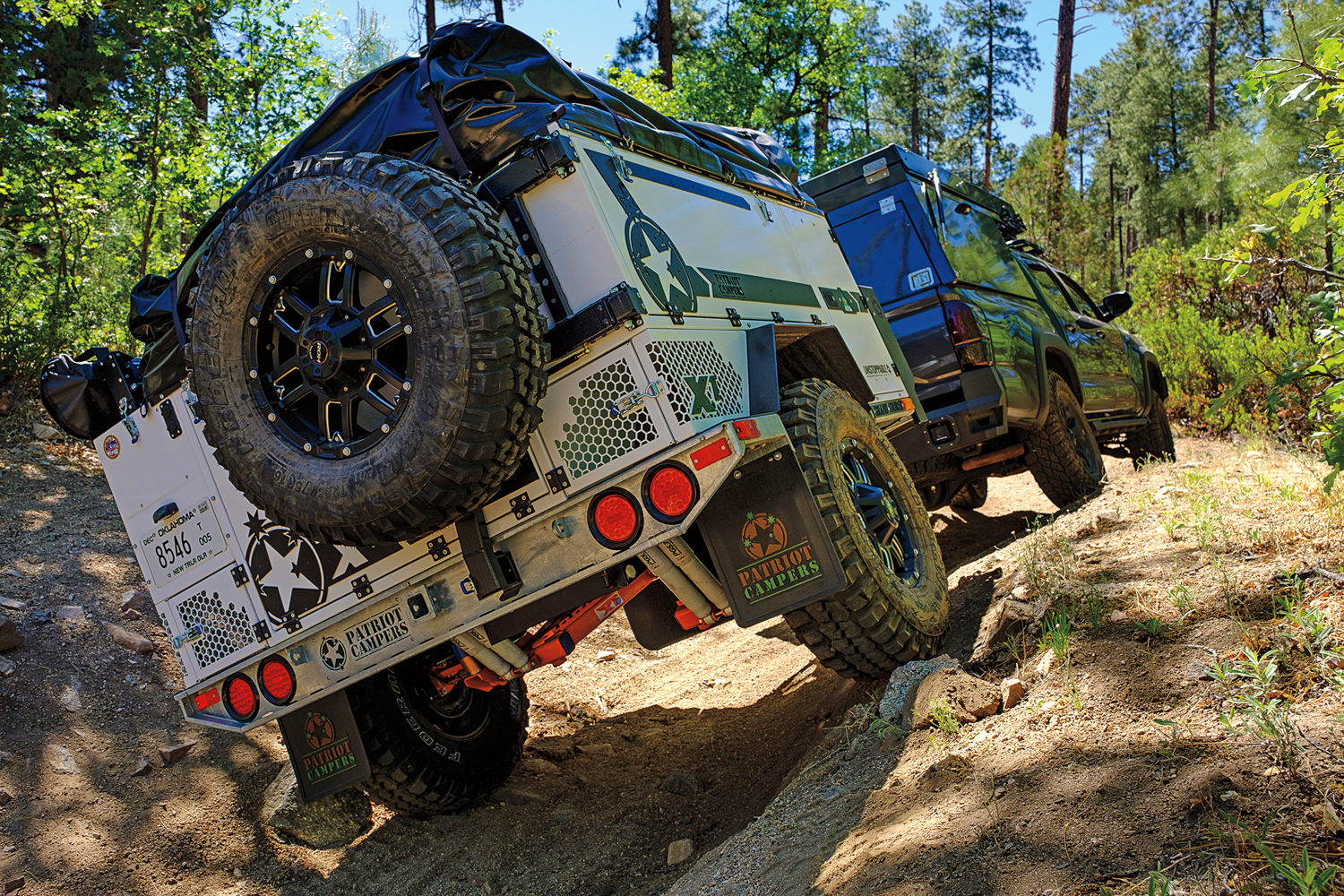 The testing process included a full inspection of the trailer and systems, followed by an initial trail test and photo shoot. Next came an on-pavement test loop that was complete with city driving, twisty roads, highways, and steep grades. This allowed us to consider highway speeds and maneuverability in traffic. For the trail, we used part of our long-standing test loop, a route that provides technical cross-axle ruts and erosion, aggressive approach and departure obstacles, and tight tolerances between trees. Here we measured traction control intervention and ease of towing through the deep gullies. We purposefully hit rocks and tree stumps with the trailer tires to evaluate suspension dynamics. And, we modulated the brakes to determine braking capacity and the ability of the driver to lock the trailer tires to allow for more advanced towing maneuvers. The last route included highspeed dirt roads with corrugation, washouts, embedded rock, and decomposed granite. This segment ended at a beautiful campsite that allowed us to time setup and compare camping comfort and support systems overnight.