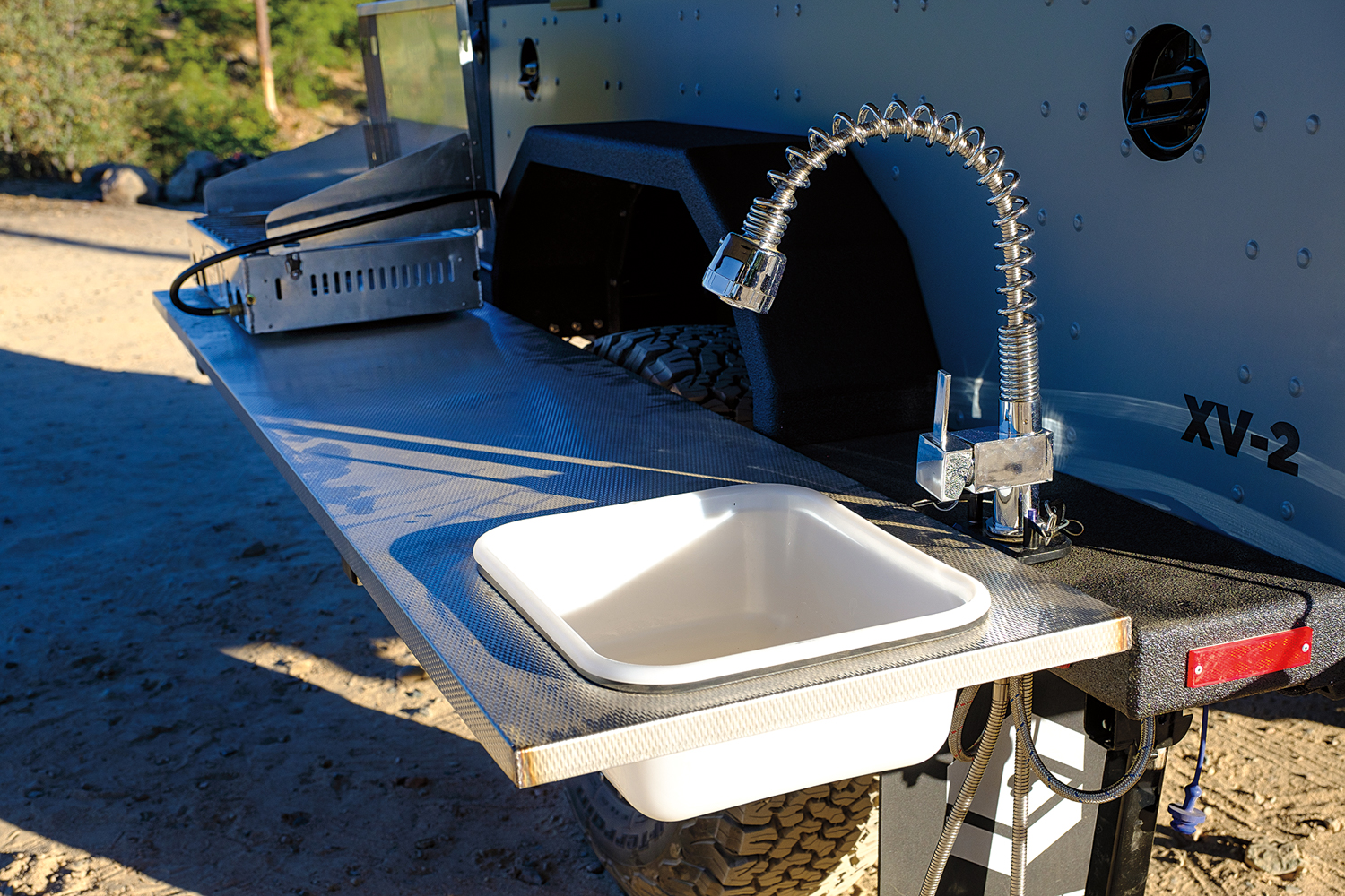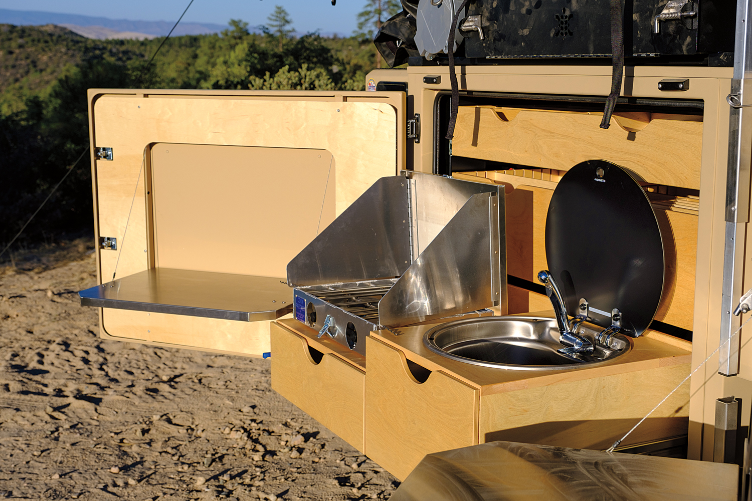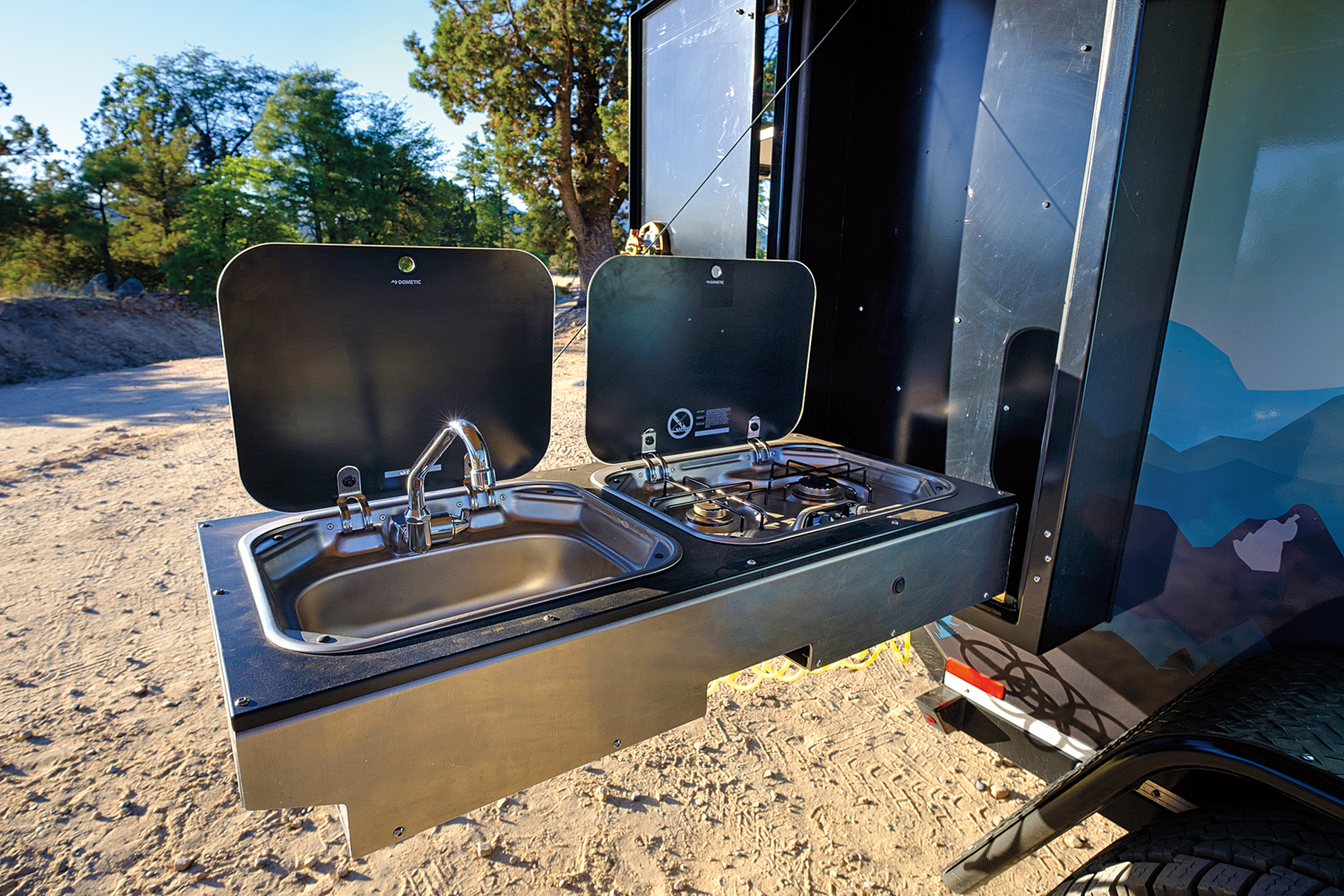 The kitchen in the Off Grid is both clever and practical. It drops out of a tall and slim compartment on the side, revealing a dual-burner stove, sink, and faucet ready to go. All you have to do is plug in the quick-connect fittings. The Dometic fridge is on a slide and located directly behind the cooking area in the forward compartment for easy access.