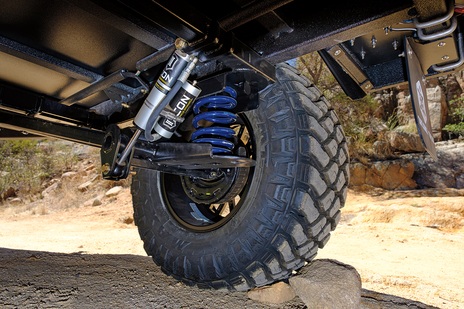 Towing the Turtleback on pavement was a pleasant enough process, checking all the right boxes of stability, low noise, and track width. The weight of the trailer is on the heavier side, and the center of gravity (COG) was higher than most in the test, so sway was noticeable, particularly during quicker transitions on curvy mountain roads. The brakes were effective and smooth to engage. One notable evolution with the Expedition is the newly available independent, coil-sprung suspension. What it lacks in adjustability (without airbags), it makes up for in reliability and overall wheel travel. Custom valved, remote reservoir Icon shocks control damping. The Hyperco coils can be moved to three different positions depending on the load and desired ride height.